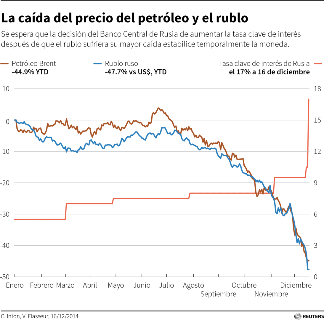 El valor de la moneda rusa está en función del precio del petróleo, que a su vez ha caído considerablemente en las últimas semanas. Mientras el precio del petróleo no sea estable, el tipo de cambio del rublo tampoco lo será, y las medidas aplicadas por el Banco Central ruso no pueden alterar mucho la situación, explica el diario ruso 'Komersant'.