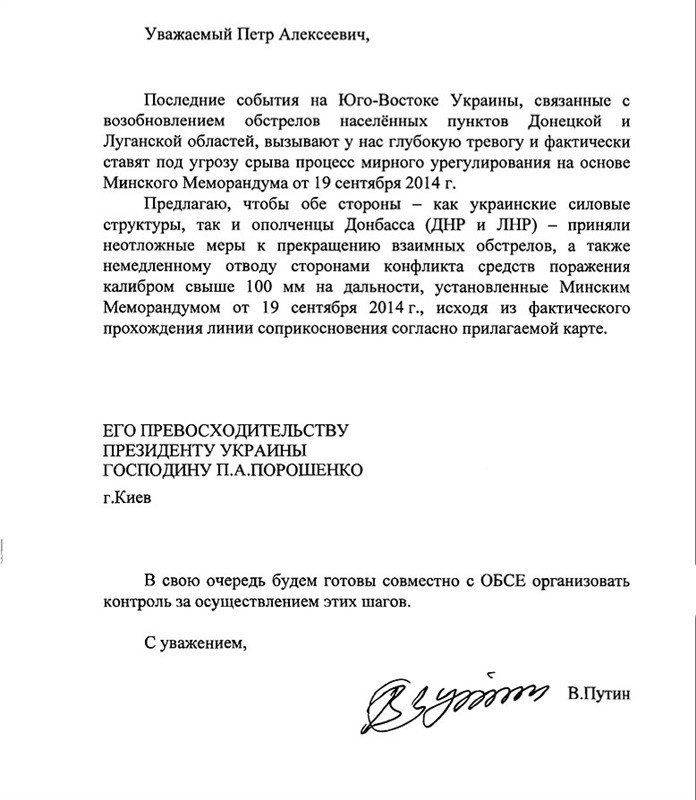 Propongo que ambas partes, tanto las estructuras de fuerza ucranianas como las autodefensas de Donbass (la República Popular de Donetsk y la República Popular de Lugansk), emprendan medidas urgentes para poner fin al fuego mutuo, así como para que ambas partes retiren inmediatamente las armas de destrucción de calibre de más de 100 milímetros a las distancias determinadas por el Memorándum de Minsk, en vigor desde el 19 de septiembre del 2014, basándose en el recorrido de la línea de contacto en conformidad con el mapa adjunto.