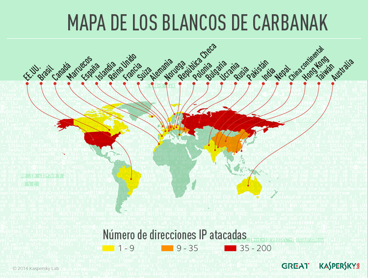 Los expertos registraron ataques contra aproximadamente 300 direcciones IP pertenecientes a 30 entidades bancarias, la mayoría rusas, en más de una veintena de países. Entre los más damnificados están además EE.UU., Alemania, China y Ucrania. Los piratas siguen actuando y están intentando ampliar sus actividades a Asia, Oriente Próximo, África, países del Báltico y de Europa central, advierte Kaspersky Lab. El total de los daños causados por la campaña bautizada 'Carbanak' de momento se estima en unos 1.000 millones de dólares.
