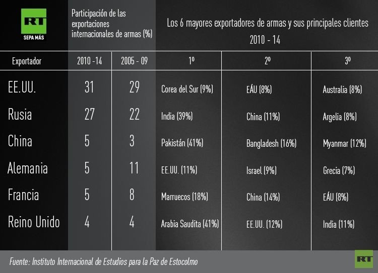 Los 5 primeros exportadores durante el período de 2010-2014, Rusia, China, Alemania, Francia y EE.UU. fueron responsables de casi el 74% de todas las exportaciones de armas.