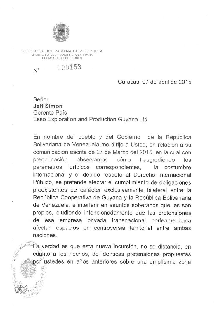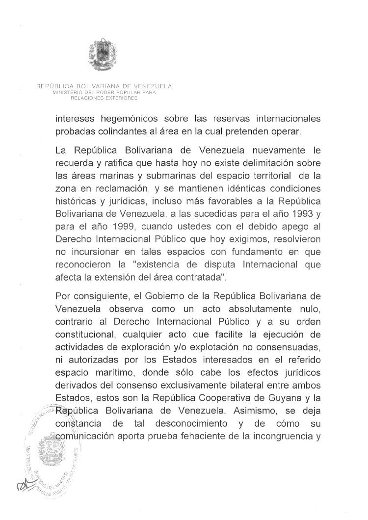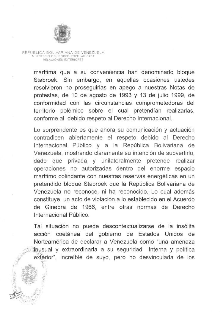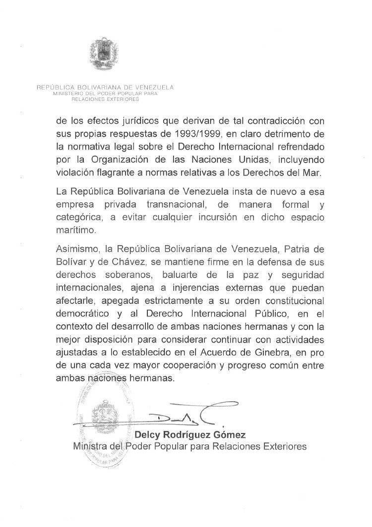 En dicho documento, la canciller ha anunciado que Venezuela exige a ExxonMobil no incursionar en espacios en reclamación entre Venezuela y Guyana, puesto que aún no existe delimitación sobre esas áreas marítimas y submarinas.