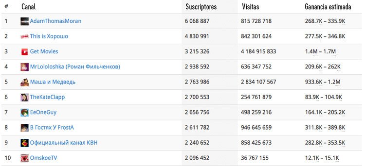 Valentín Petujov, un popular 'videobloguer', especializado en juegos y tecnología, se ha hecho eco de los datos ofrecidos por el sitio web Whatstat.ru, donde se revelan los ingresos aproximados recibidos a través del programa de socios de YouTube, donde los 'bloguers' comparten con la red social los dividendos obtenidos a razón de la publicidad mostrada en sus canales, informa 'siliconrus.com'.