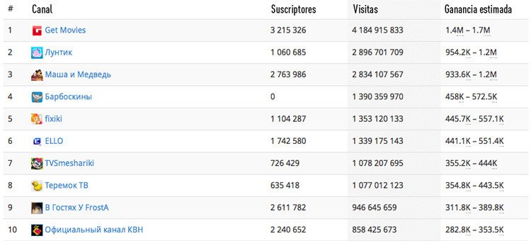 Los reyes del YouTube en Rusia han obtenido cuantiosas ganancias. 'Get Movies' encabeza la lista con ingresos estimados entre 1,4 y 1,7 millones de dólares. El segundo puesto es para 'Luntik', con un saldo entre 954.200 y 1,2 millones, mientras que el podio lo cierra 'Masha y el oso' con ganancias aproximadas de entre 933.600 y 1,2 millones de dólares, cifras que no pueden ser catalogadas como un 'juego de niños'.