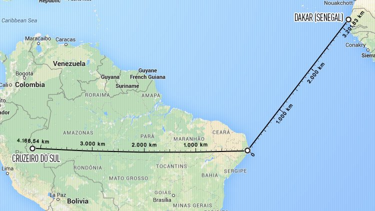 La ciudad de Recife, en el estado brasileño de Pernambuco (una de las cuatro ciudades brasileñas que llevan este nombre) está más cerca de las ciudades africanas de Dakar en Senegal, Freetown en Sierra Leona y Monrovia en Liberia, que de la ciudad Cruzeiro do Sul en el oeste de Brasil.