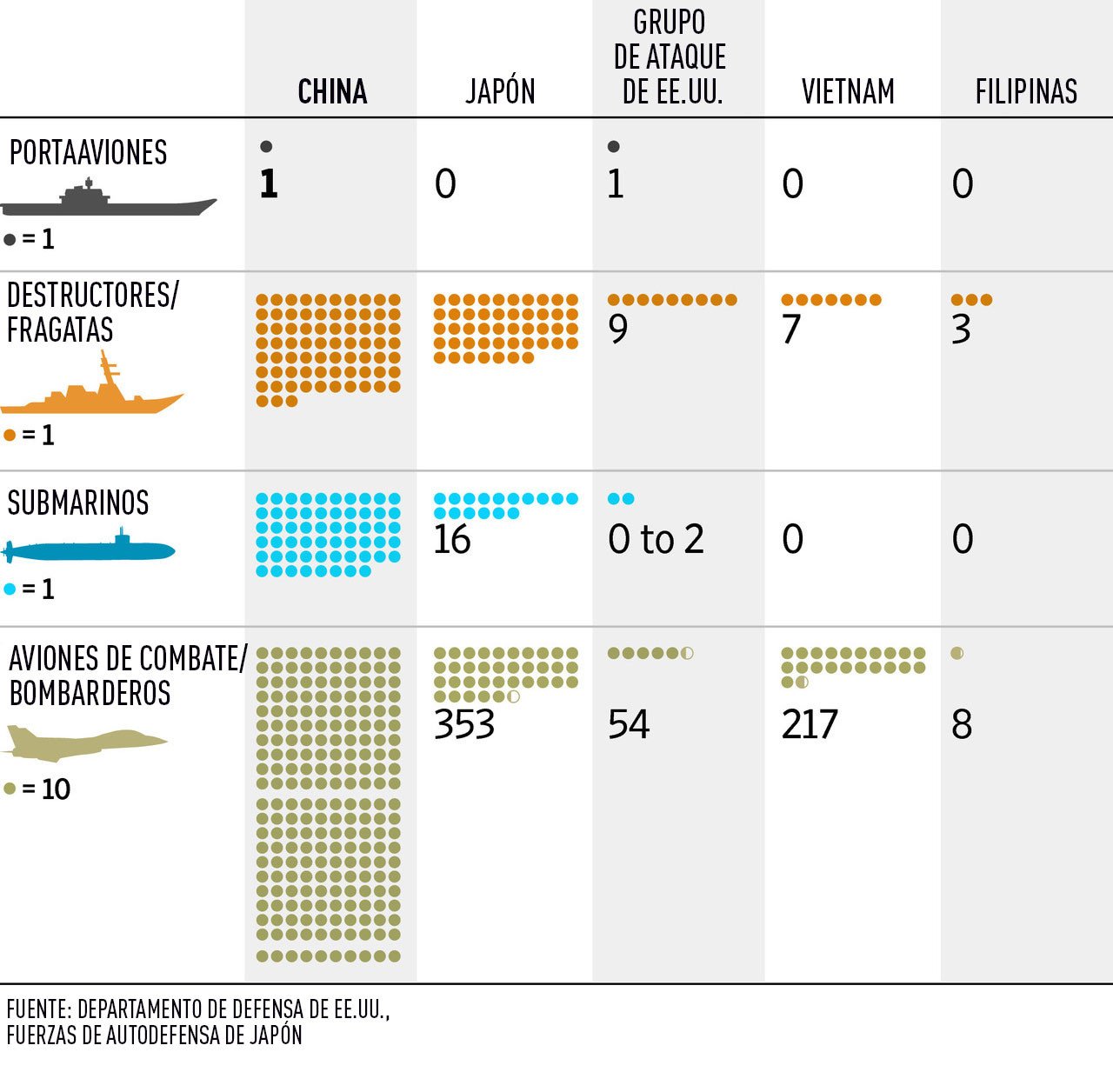 Mientras, China posee grandes capacidades para superar a sus potenciales rivales. A pesar de contar con un solo portaviones, las islas artificiales en construcción servirían para mantener sus operaciones a cientos de kilómetros del territorio continental. Además, según el Pentágono, Pekín "está haciendo grandes inversiones en armamento con el que rompería las ofensivas del enemigo y contrarrestaría a terceros, incluyendo EE.UU.".