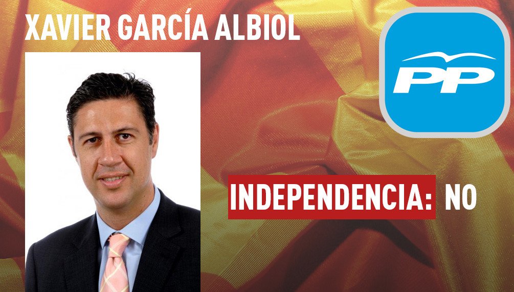 Partido Popular (PP). Los populares se oponen frontalmente a la vía independentista, porque -afirman- ésta no llevará a Cataluña a ninguna parte. El candidato a la Generalitat, Xavier García Albiol, no descarta la posibilidad de unirse con las formaciones contrarias a la independencia después del 27-S. Conseguirían el 9,6% de los votos.