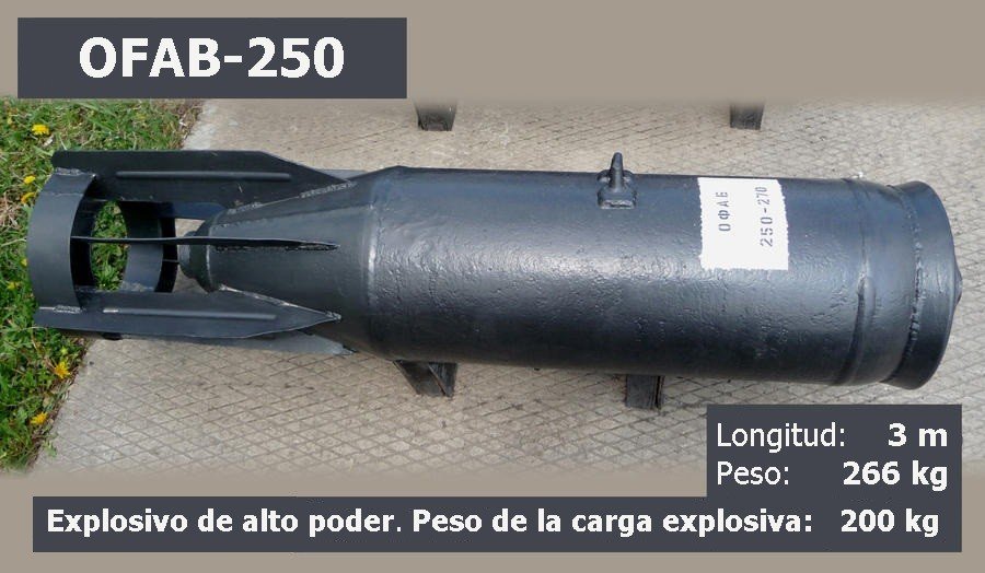 Otra de las armas utilizadas por la Fuerza Aérea de Rusia es la bomba de explosivo de alta potencia OFAB-250, que se utiliza para destruir blancos no protegidas, como los campos de entrenamiento y las bodegas de armamento.