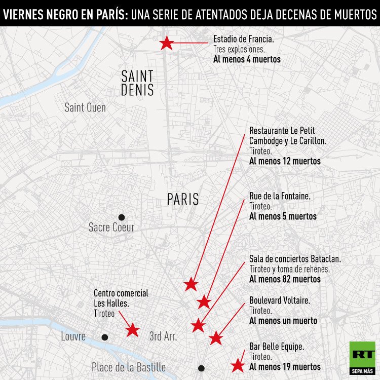 El 13 de noviembre quedará marcado por la serie de atentados ocurridos en París. La capital francesa sufrió ataques coordinados: varias explosiones cerca del Estadio de Francia, tiroteos en dos restaurantes, en un bar, en un centro comercial y una toma de rehenes en una sala de conciertos.