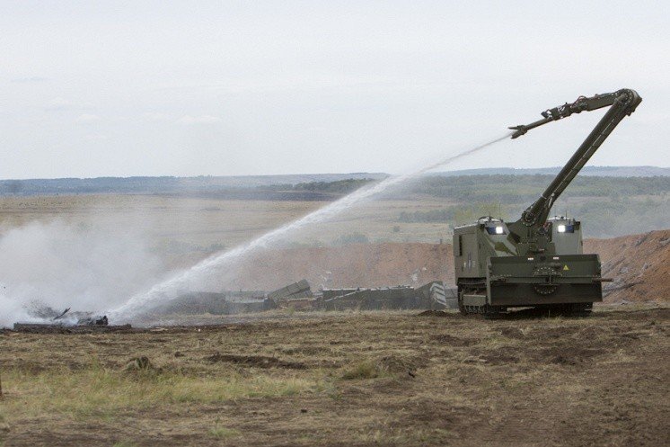 Este aparato está diseñado para extinguir incendios en instalaciones militares de alto riesgo, incluidos almacenes de armas y municiones. Tiene un peso de 14 toneladas y puede repostar dos toneladas de agua y 600 litros de espuma.