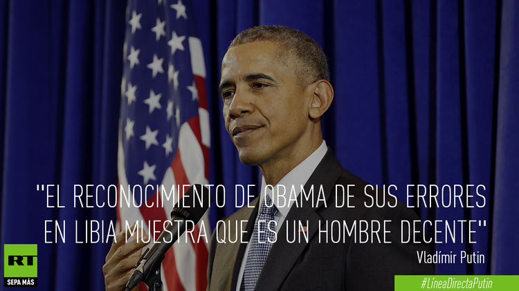 Respecto a las recientes declaraciones de Obama sobre las consecuencias de la intervención de Washington en Libia, el presidente ruso Vladímir Putin ha afirmado que confirman que el mandatario estadounidense es "un hombre decente". "Lo digo sin ironía. Decir tales cosas no es fácil. Barak, como senador, criticó las acciones del Gobierno en Irak. Por desgracia, como presidente, él mismo cometió los errores que dijo".