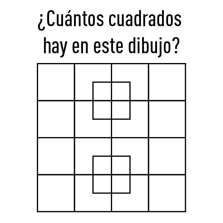 Si logra encontrar todos los cuadrados, la respuesta correcta es cuarenta. En total, el diagrama está compuesto de 8 cuadrados pequeños, 18 cuadrados de un centímetro, 9 cuadriláteros de 2x2, 4 cuadrados de 3x3 y 1 cuadrado de 4x4.