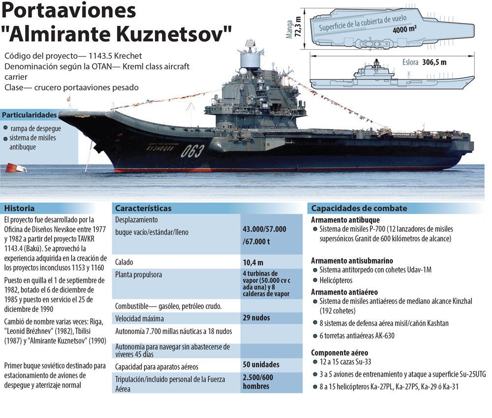 - El pesado crucero-portaaviones Admiral Kuznetsov —único en su clase en la Armada rusa— se encuentra en servicio activo desde 1991.