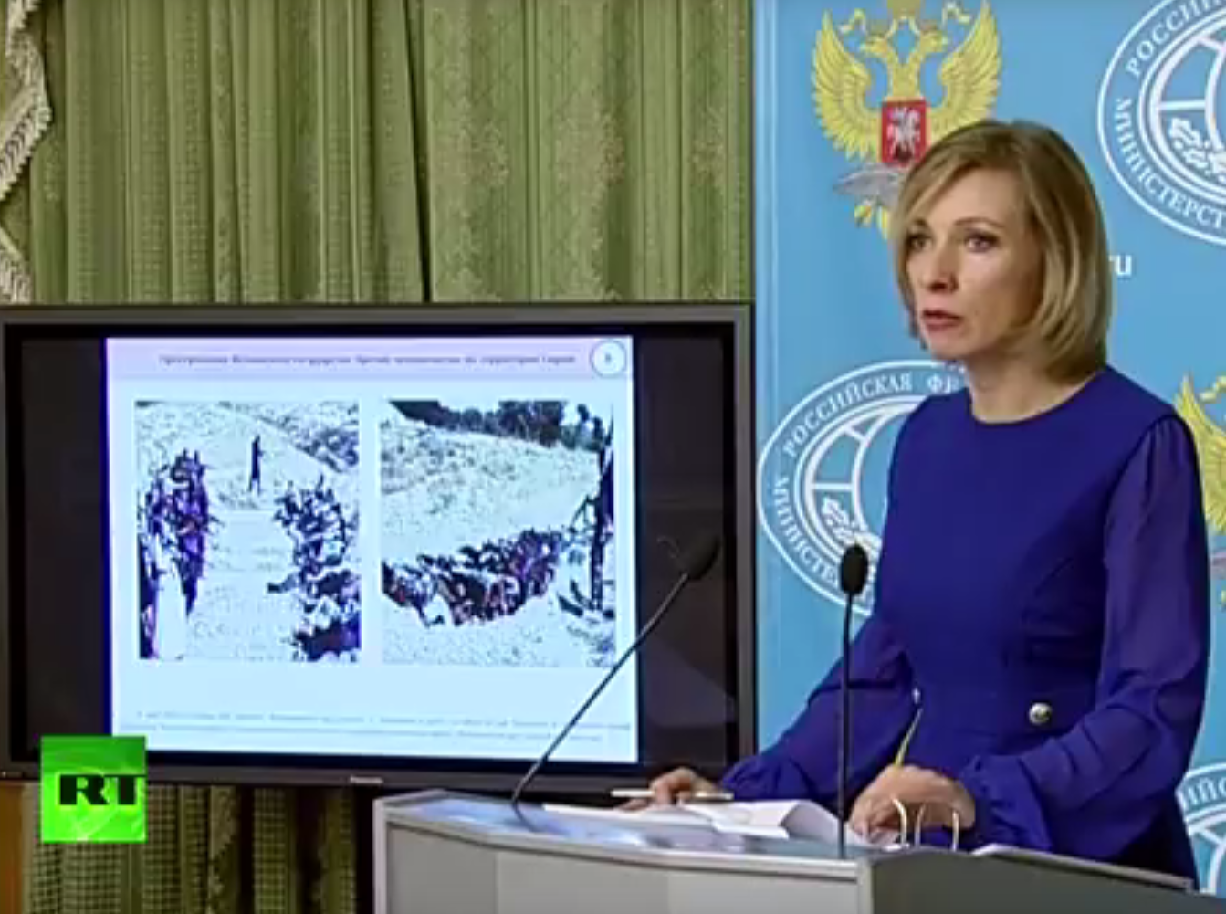 Este jueves, la portavoz del Ministerio de Exteriores de Rusia, María Zajárova, ha ofrecido una rueda de prensa en la que ha mostrado varias fotografías sobre las atrocidades que ha cometido el Estado Islámico y ha dedicado una de las imágenes a la representante de Estados Unidos ante las Naciones Unidas, Samantha Power.