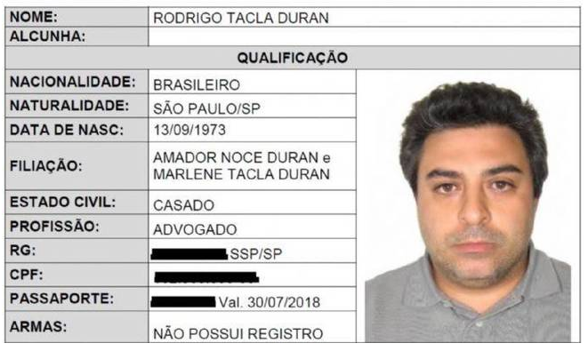 Rodrigo Tacla Durán, de 43 años, de nacionalidad brasileña y española, era abogado de la empresa constructora Odebrecht. Según informa la Guardia Civil, fue detenido en un céntrico hotel de Madrid tras haber llegado días antes desde Estados Unidos, país en que se había ocultado tras su huida desde Brasil.