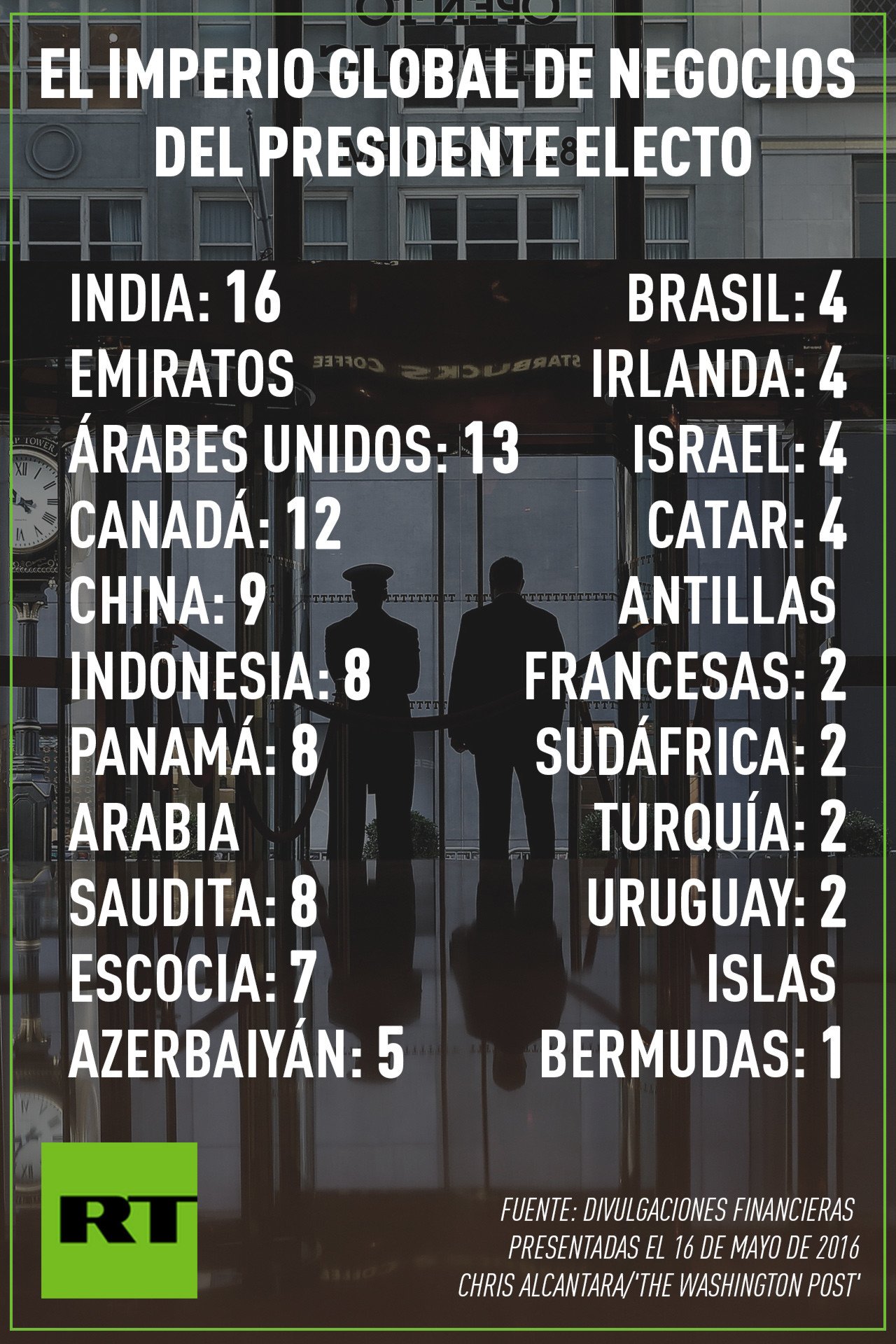 Asimismo, el periódico publicó una infografía que muestra 18 países del "imperio global de negocios del presidente electo", y observa que Trump tiene un gran número de propiedades fuera de EE.UU.: