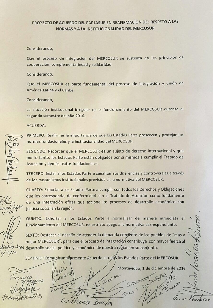 Pero mientras los gobiernos destituían a Venezuela, el parlamento de Mercosur -dominado en su mayoría por la derecha- aprobaba un acuerdo en el que se exige el respeto a las normas internas del bloque y la resolución de las controversias dentro del propio mecanismo, tal como fue planteado desde el principio por Caracas.