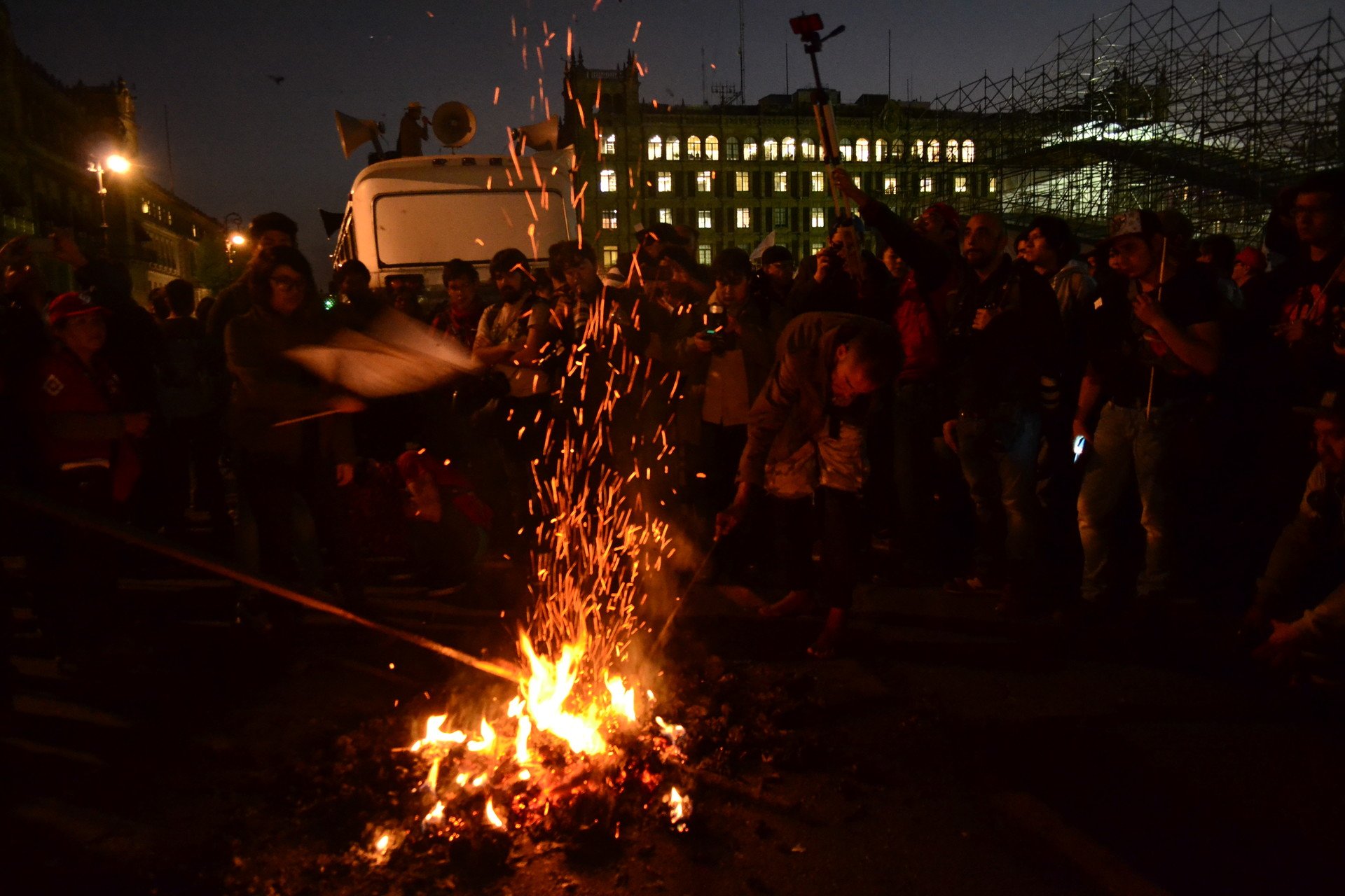 Si bien el Zócalo, la plaza principal de la capital, se encontraba ocupada por una enorme pista de hielo navideña, los manifestantes improvisaron mítines frente a la catedral mexicana y dieron vueltas alrededor de la plaza coreando consignas.
