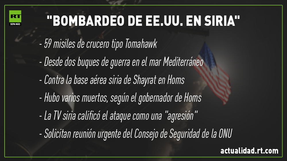 Cerca de las 4.40 a.m. de este viernes hora local en Siria, 59 misiles de crucero Tomahawk fueron lanzados desde un buque de guerra estadounidense ubicado en el mar Mediterráneo. Según el Gobierno estadounidense, esta operación ha sido llevada a cabo como represalia por un supuesto ataque con armas químicas ejecutado por el Gobierno sirio desde la base aérea de Shayrat.