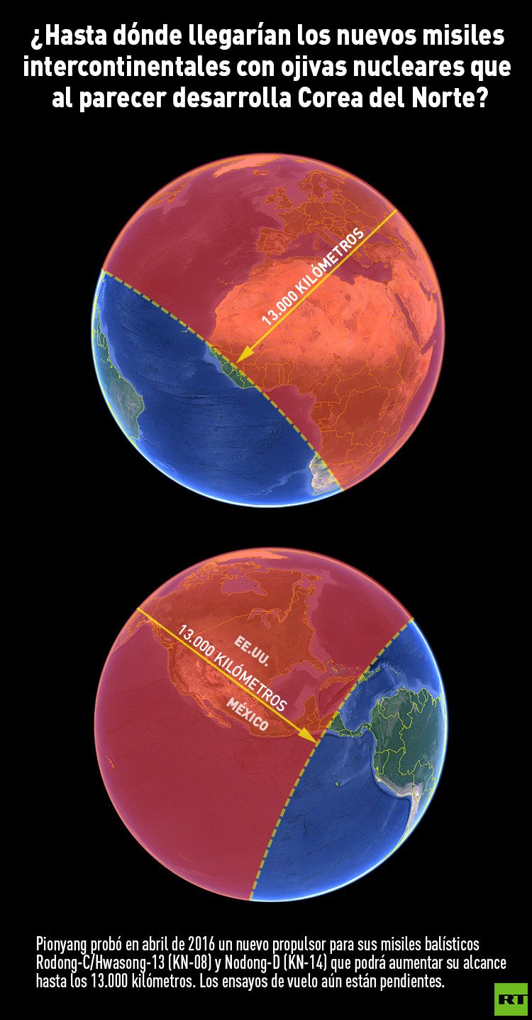 Otra cuestión es el volumen de armas nucleares en disposición de Pionyang y hasta dónde podría llevarlas. Según datos de Bloomberg, Corea del Norte puede llegar con hasta 20 bombas nucleares hasta Corea del Sur y Japón. Pero en abril de 2016 probó un nuevo propulsor que, en caso de ser instalado a sus misiles balísticos móviles KN-08 y KN-14, podría aumentar su alcance hasta los 13.000 kilómetros, es decir, Pionyang podrá alcanzar la mitad del mundo en los próximos dos años, señala Space.com.