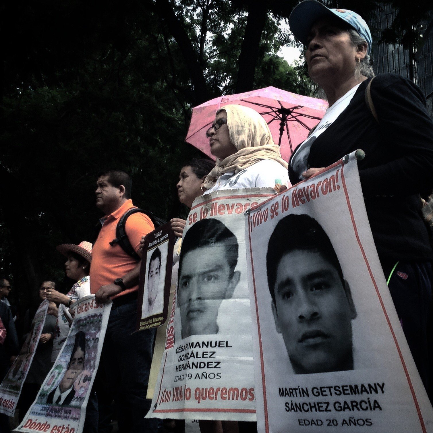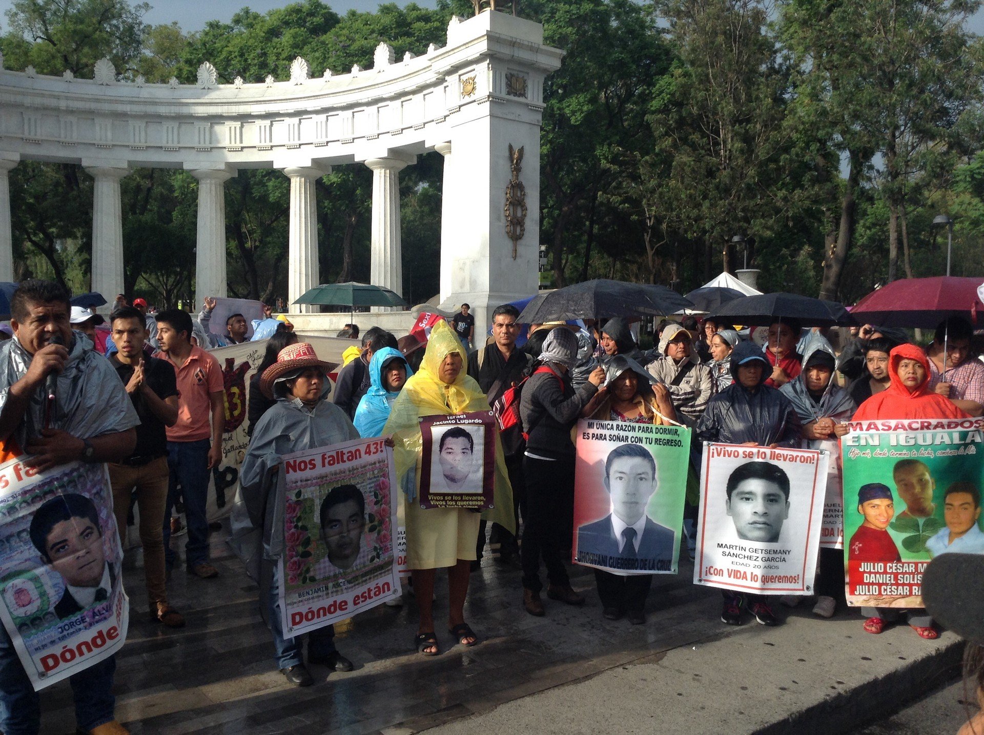 Seguidos de cientos de personas que lanzaban diversas consignas en la Avenida de la Reforma, arteria principal de la capital mexicana, las familias recordaron el conflicto diplomático que arreció entre México y Venezuela por este caso: "El secretario de Relaciones Exteriores bien que puede reclamarle al país hermano de Venezuela sobre derechos humanos, pero a nosotros no nos da respuesta" denunció Melitón Ortega, familiar de uno de los estudiantes.