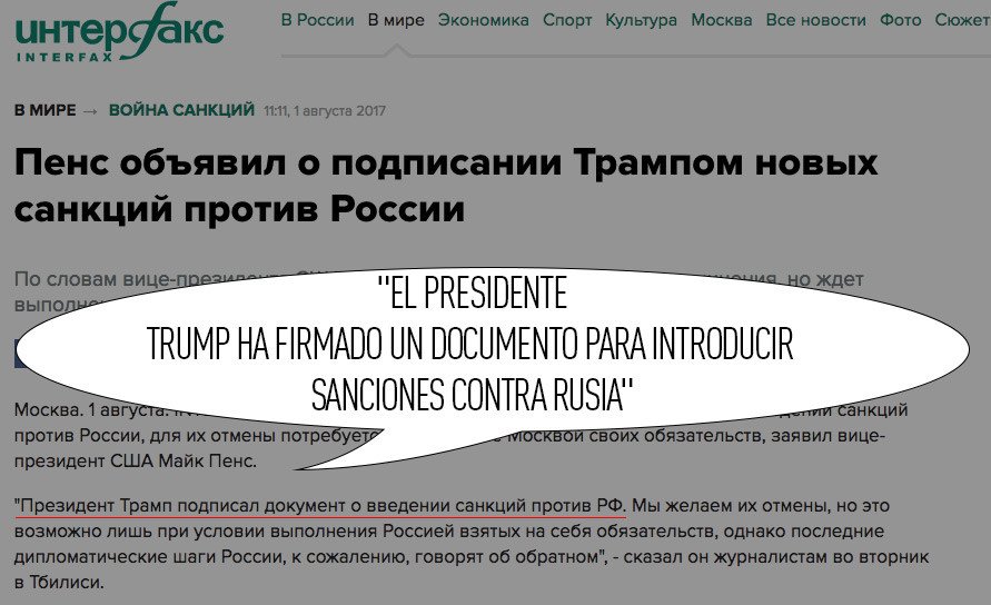 "El presidente Trump firmará un documento sobre la introducción de sanciones contra la Federación Rusa. Nosotros queremos que sean canceladas, pero esto es posible solamente si Rusia se atiene a sus compromisos. Sin embargo, las últimas acciones diplomáticas rusas, por desgracia, cuentan una historia diferente", declaró Pence a la prensa en Tiflis (Georgia) este martes.