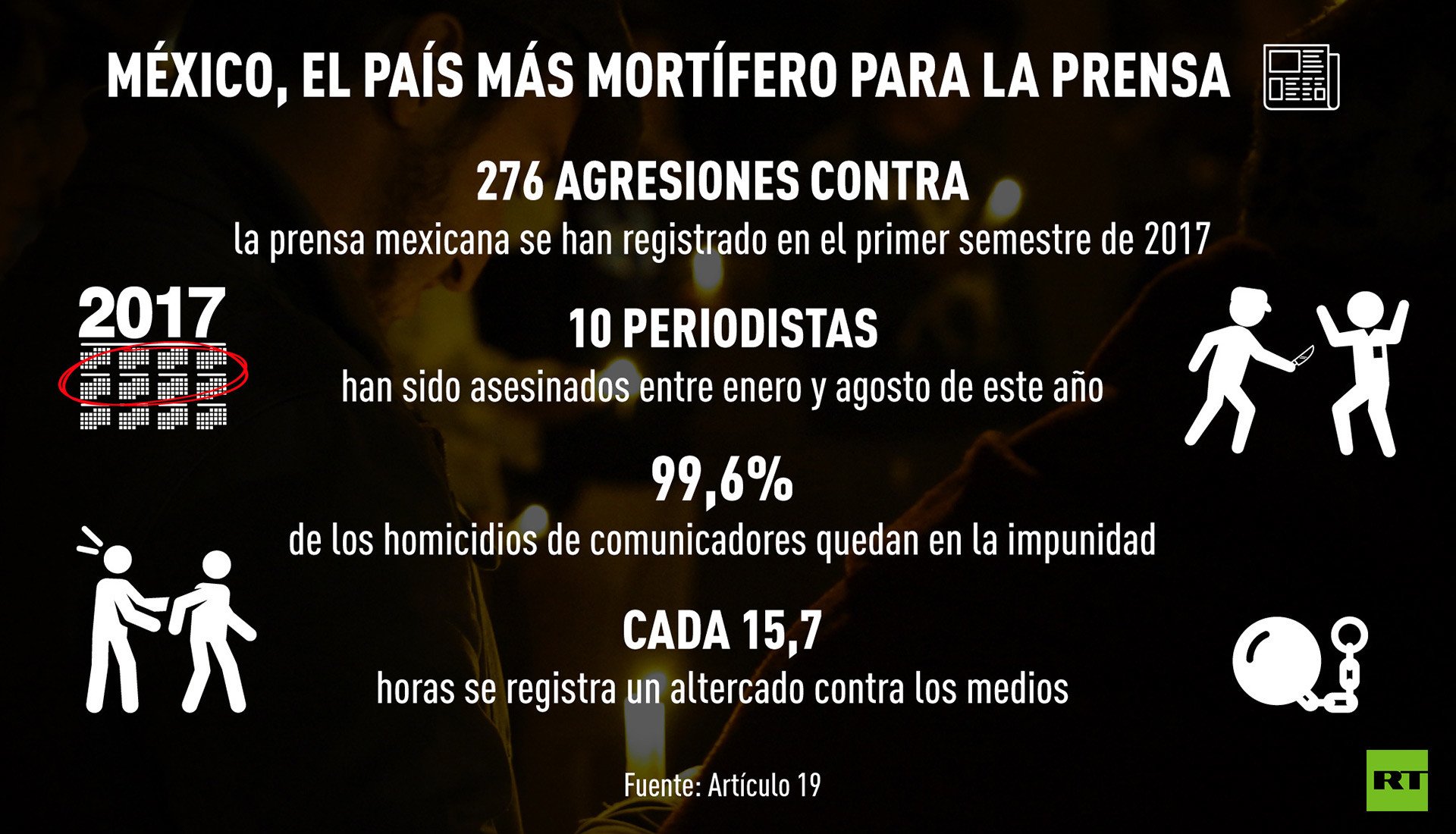 De acuerdo con el organismo, en México se han registrado 276 agresiones contra la prensa en el primer semestre de 2017, y una decena de comunicadores más han sido asesinados hasta agosto de este año.