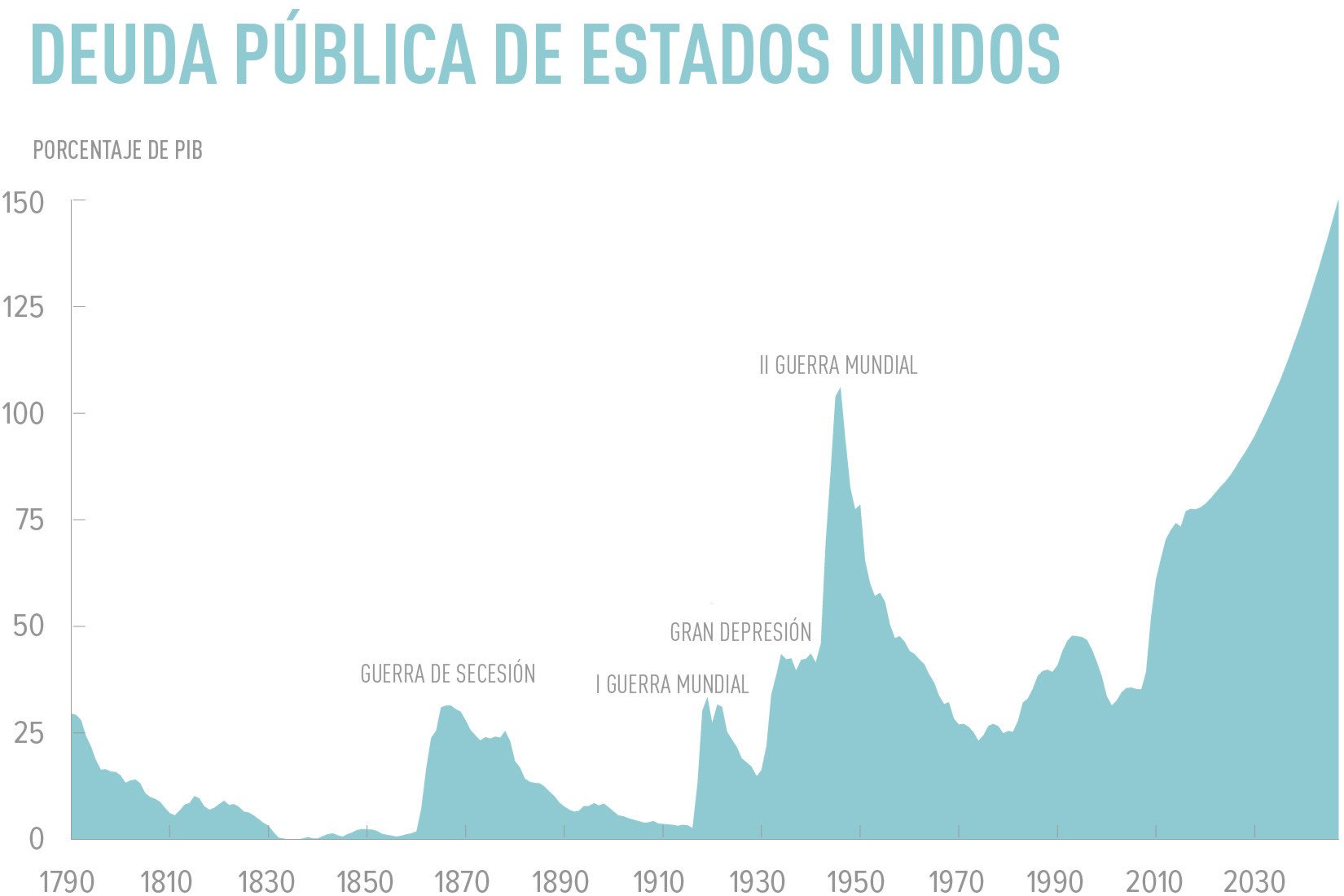 La Oficina de Presupuesto del Congreso de EE.UU. (CBO, por sus siglas en inglés) indicó que la deuda federal actual se encuentra en su máximo nivel desde la Segunda Guerra Mundial y pronostica que la deuda áumentará manera pronunciada en los próximos 30 años, hasta alcanzar el 150 % del PIB en 2047.