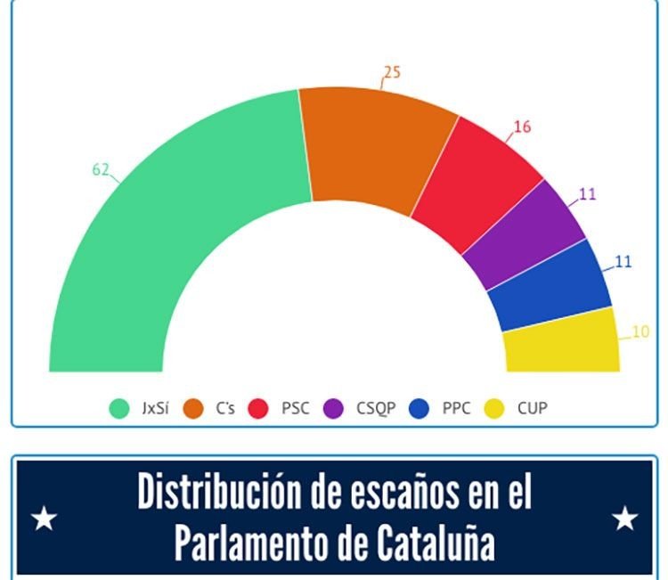 • Junts pel Sí (JxSí): Se trata de una coalición electoral de varios partidos de la derecha y la izquierda creada para concurrir a estos comicios. Concretamente, estas formaciones son Convergencia Convergencia Democrática de Cataluña - actualmente PDeCAT -, Esquerra Republicana de Catalunya (ERC), Demócratas de Cataluña y Moviment d’Esquerres. Obtuvo 62 diputados.