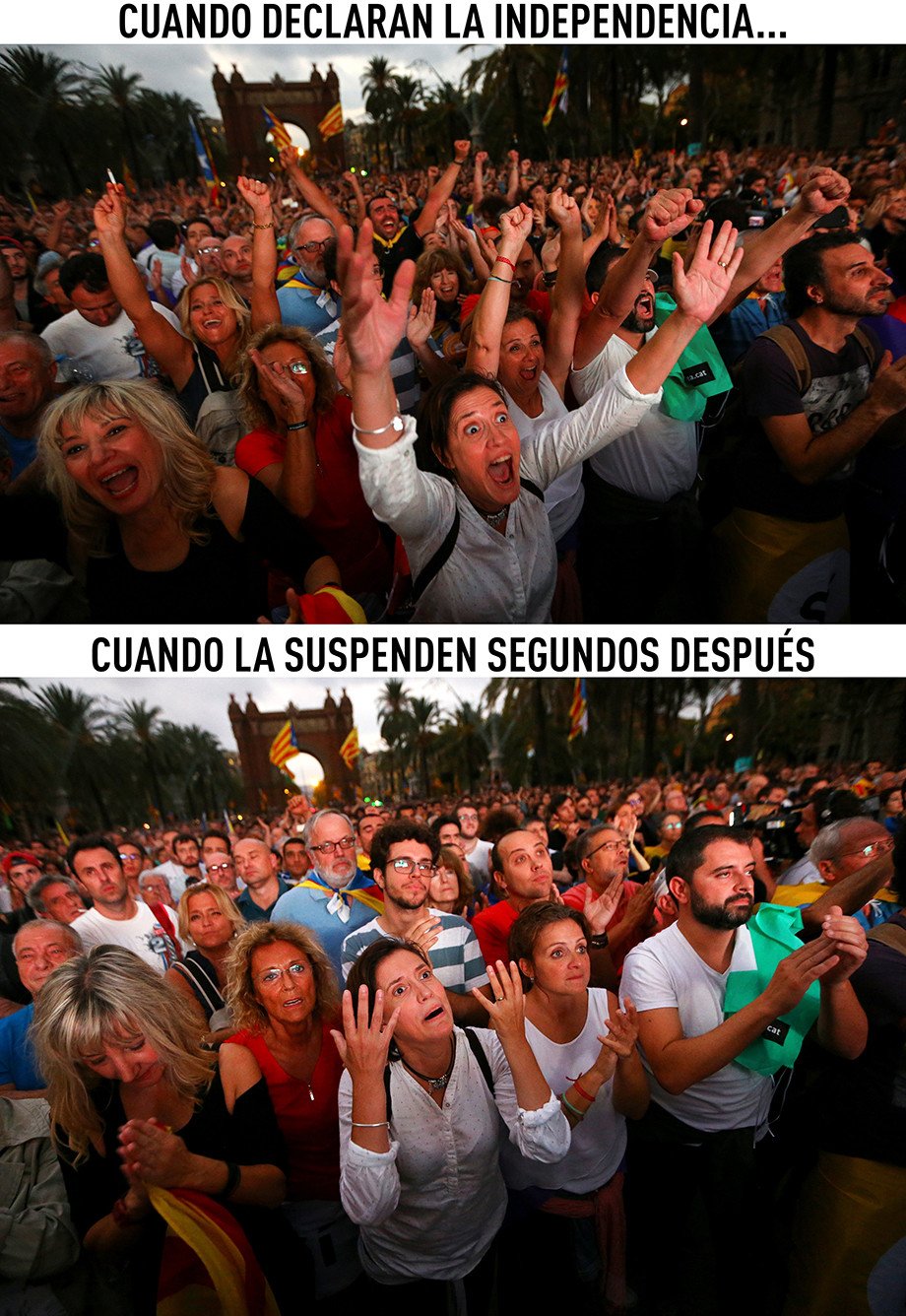 La Generalitat publicó en su cuenta oficial de Twitter una foto en la que el presidente de Cataluña, Carles Puigdemont, firma la declaración de independencia. No obstante, el político ha propuesto suspender el efecto de la declaración de independencia para abrir un periodo de diálogo y mediación.