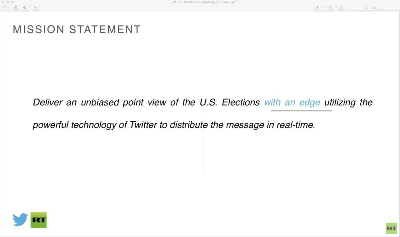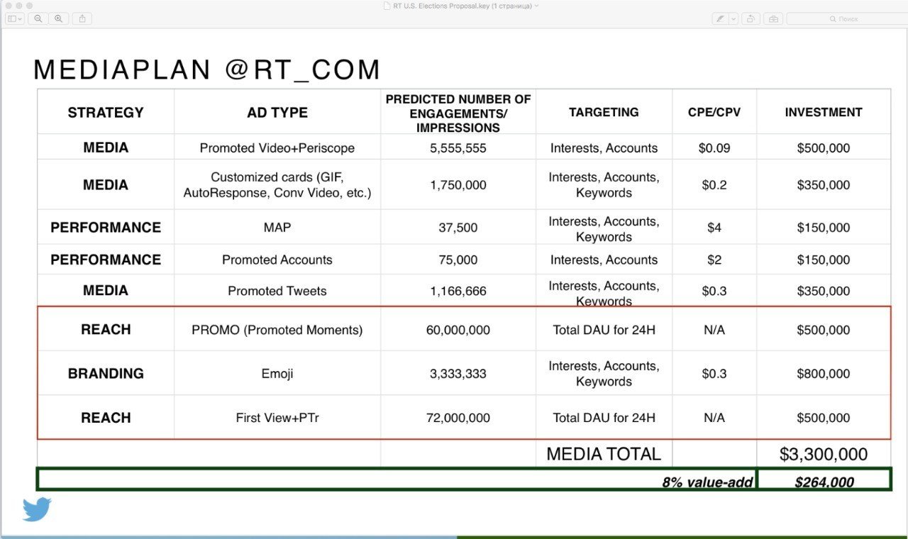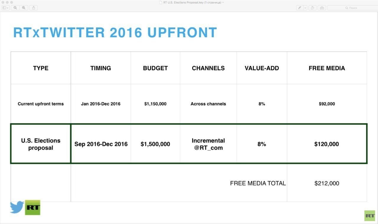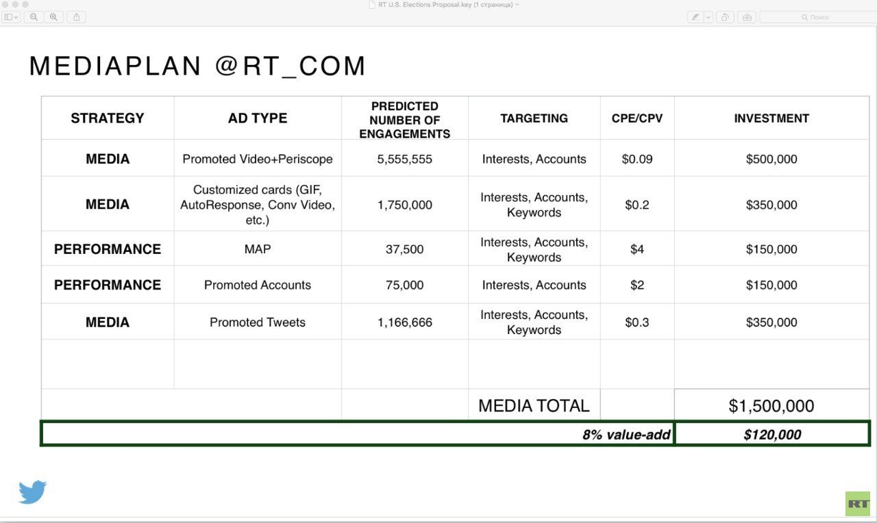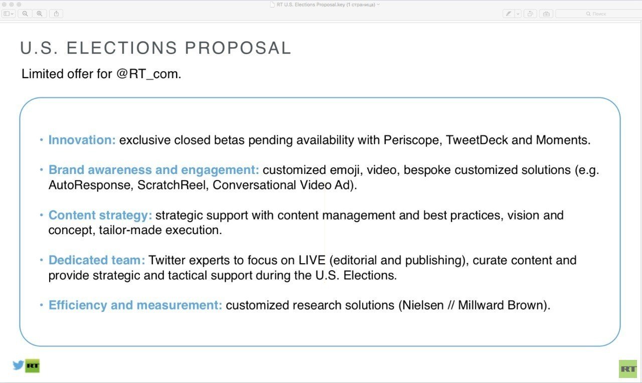 RT ha publicado la presentación completa de la propuesta publicitaria de Twitter, la cual fue recibida por la cadena durante la campaña electoral de 2016 en EE.UU.