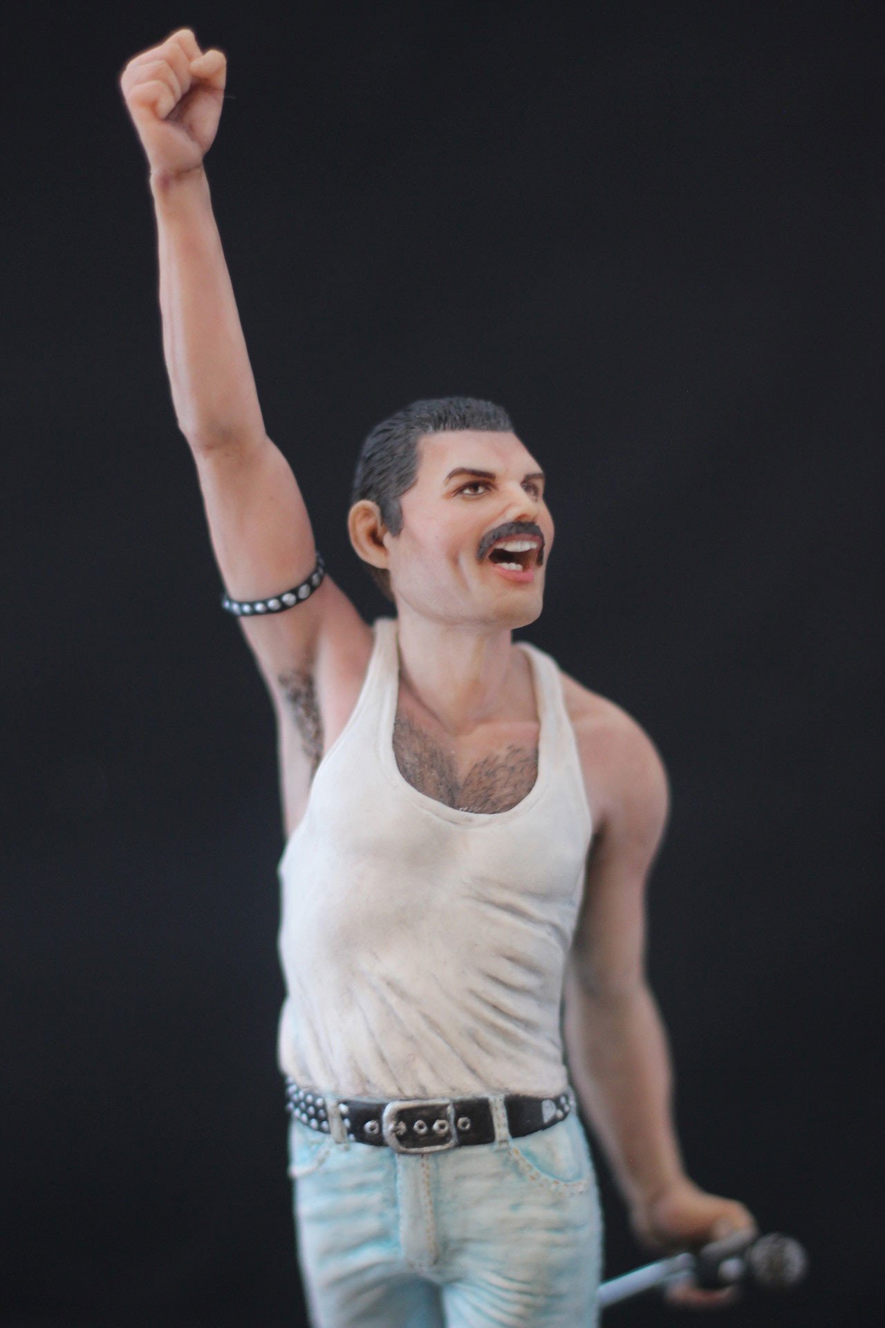 Con una sencilla herramienta de trabajo, modela la dentadura característica de Mercury, su rostro de pronunciados pómulos, sus orejas, sus labios, la cuenca de sus ojos, su bigote poblado, hasta llegar a sus músculos y a su estampa.