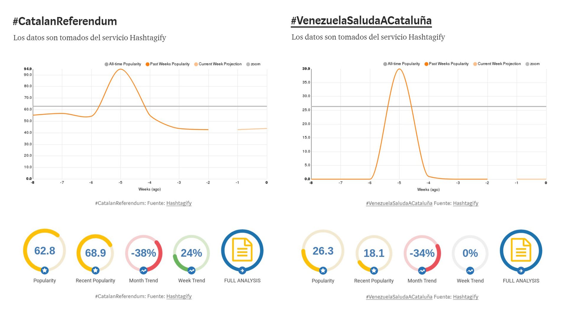 En la parte venezolana de la trama mencionan a @MarianoEscalante, una cuenta chavista de poco más de 3.000 seguidores, a la que difícilmente podemos considerar 'influencer'. Según El País, esta cuenta fue clave en posicionar la etiqueta #VenezuelaSaludaACataluña, pero como demuestra el especialista en tecnologías de la información Damián Fossi en su blog, esta etiqueta no llegó a trending topic en ningún momento, al contrario que #CatalanReferendum, la utilizada por El País, BBC y CNN, entre otros medios de información.