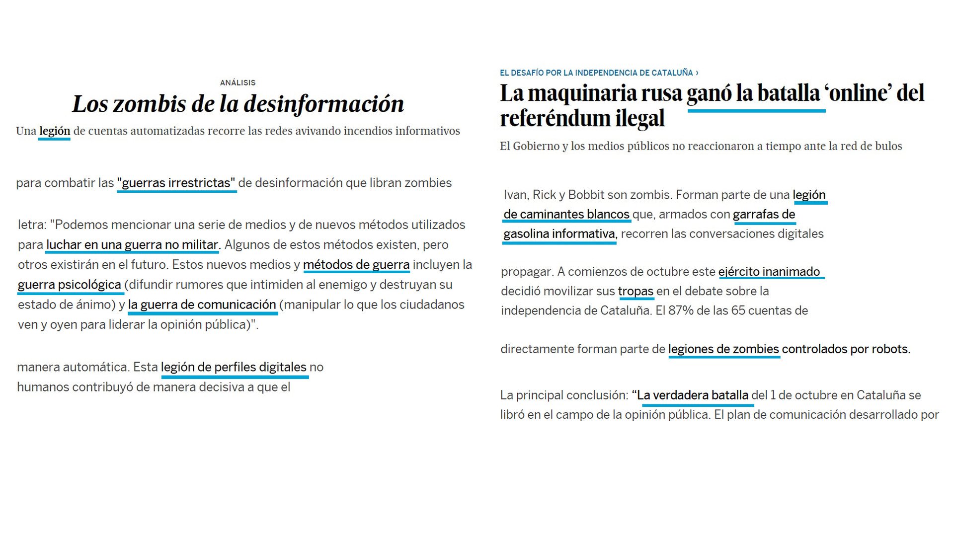 Más allá de las numerosas imprecisiones o directamente falsedades a la hora de señalar a los supuestos 'bots' rusos, llama la atención el uso (podríamos decir incluso, el abuso) por parte de Lesaca y Alandete de una retórica belicista rica en metáforas que emplean términos de guerra. Y cabe preguntarse si este lenguaje es el apropiado a la hora de hablar del proceso de reenvío de tuits y cuando se está acusando a otro país de ser el responsable de este reenvío y de sus 'terribles' efectos en el panorama político de otro Estado. Recordemos: se trata de tuits y de publicaciones en redes sociales. Un poco de tranquilidad.