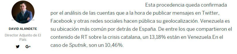 Pocas veces habíamos visto una utilización más tramposa de los números en un medio supuestamente serio. Se resalta que "Venezuela es su ubicación más común", por encima del hecho de que no, no es la más común: la más común es la que nombran después, España. Pero se olvidan (muy convenientemente) de señalar el porcentaje de los mensajes provenientes de España. Los números del primer país son importantes cuando nos muestran los del segundo. Si España, como primero, tuviera un 25% y Venezuela un 13%, el porcentaje de Venezuela sería muy significativo y a todas luces extraño. Pero si España, país donde ocurre la noticia, tiene un 80% y Venezuela un 13%, los números de este segundo país no dejan de ser anecdóticos. Del olvido de El País deducimos que el porcentaje de España es lo elevado que le corresponde, mientras que el de Venezuela se debe al interés de este país por lo que sucede en España por las razones que ya hemos comentado. También sería conveniente saber los nombres de los que vienen después, porque seguramente corresponden a los otros países donde RT tiene un seguimiento considerable.