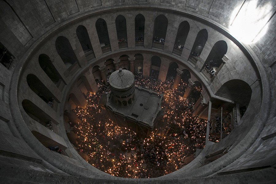 7. Los cristianos ortodoxos, los coptos y la Iglesia apostólica armenia no se limitan con venerar los milagros del pasado, sino que esperan de este mismo lugar, el Santo Sepulcro, el contacto con lo divino cada año. Cada víspera de la Pascua Ortodoxa, el Sábado Santo, el templo se convierte en escenario del descenso de la Luz Sagrada. Desde 1106 este rito es considerado como el único milagro anual bien documentado.