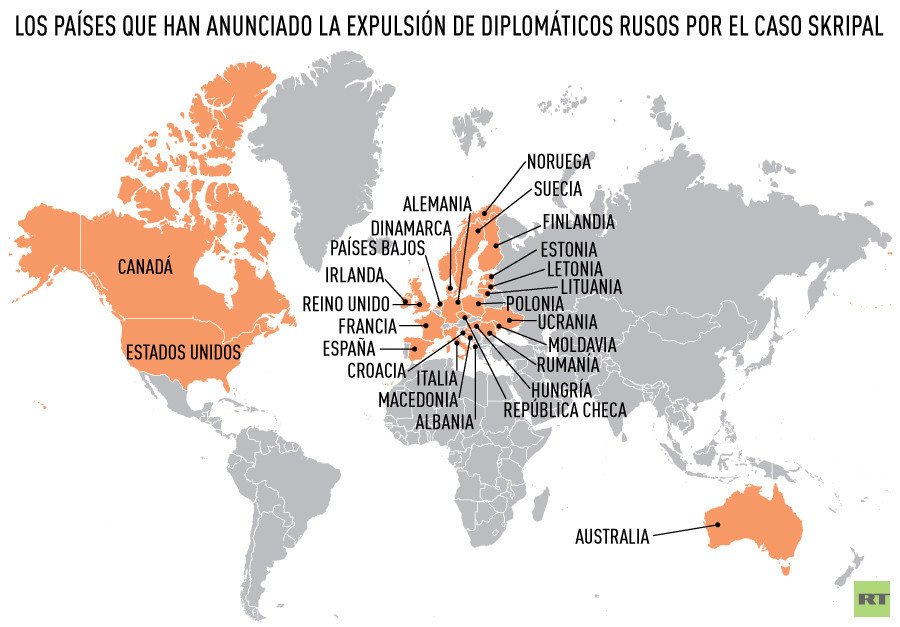 Este lunes, Washington decidió expulsar a 60 diplomáticos rusos por el caso Skripal, además de ordenar el cierre del Consulado de Rusia en Seattle. Otros 24 países, entre ellos 17 Estados miembros de la Unión Europea, anunciaron medidas similares, aunque a menor escala.