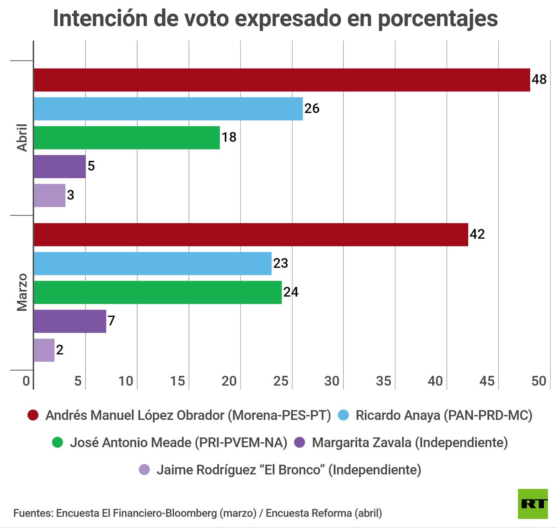 De acuerdo con una encuesta publicada el 18 de abril por el diario Reforma, el izquierdista López Obrador, candidato presidencial de Morena, posee el 48% de las preferencias electorales de los mexicanos. Le siguen Ricardo Anaya, de la coalición PAN-PRD-MC, con el 26%; el oficialista José Antonio Meade, del PRI, con el 18%.