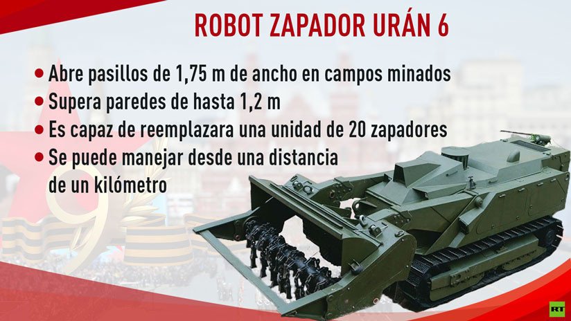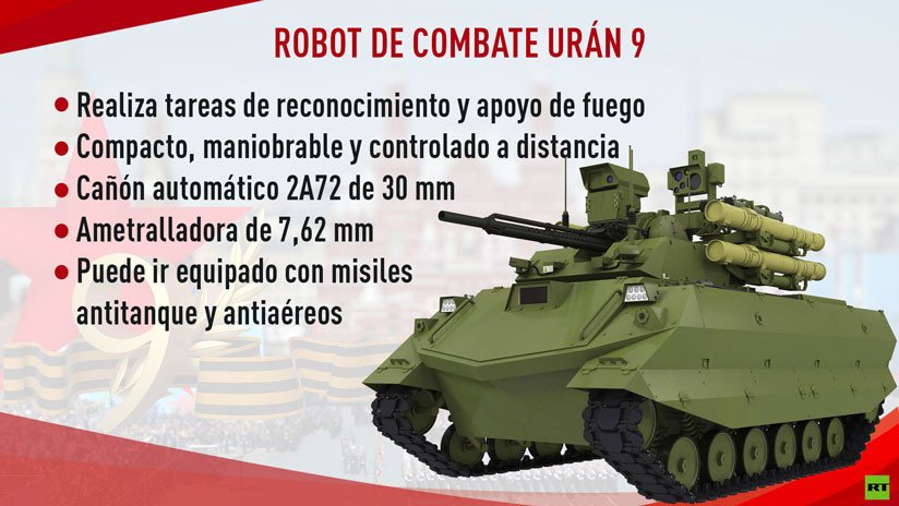 El vehículo robotizado armado Urán 9, diseñado para proporcionar apoyo de fuego y realizar labores de reconocimiento,entra en combate sin tripulación, lo que no le impide perforar la coraza de 900 milímetros de los blindados del enemigo a distancias de hasta seis kilómetros, como si fuera un tanque.