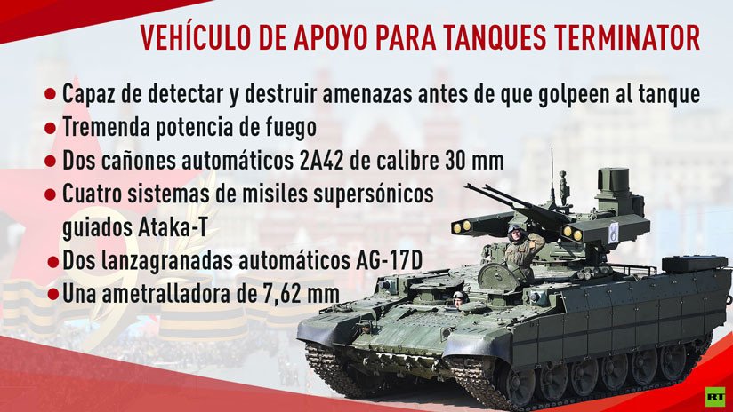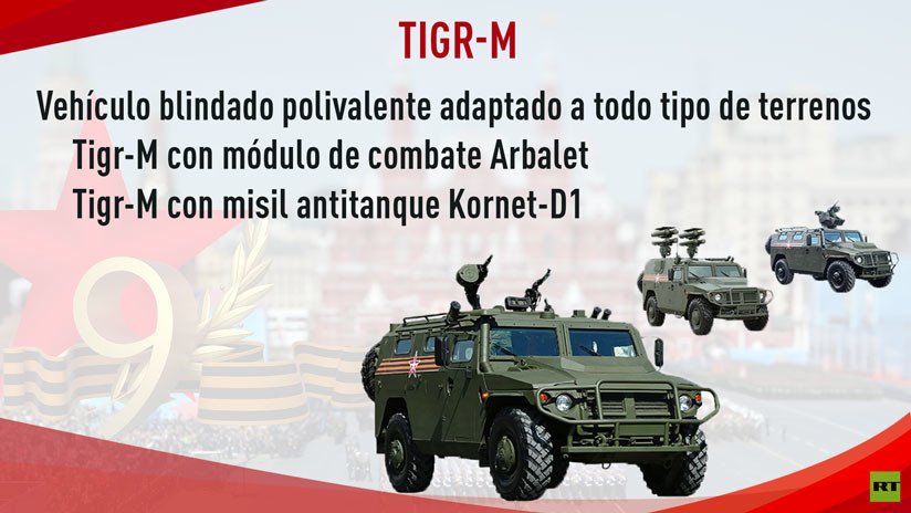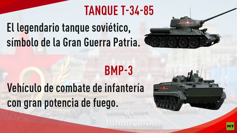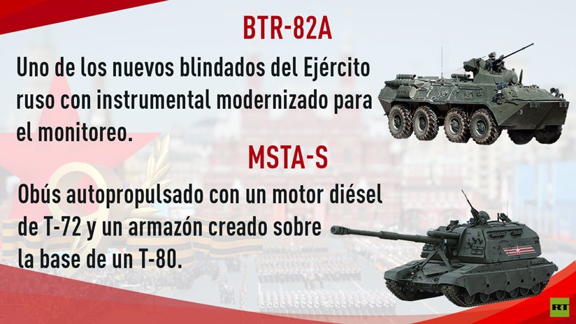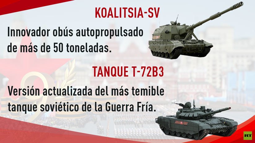 Asimismo, por la Plaza Roja se dejarán ver los tanques T-72B3, además de los Bumerang, BMD-4M, BMD-MDM, sistemas de artillería autopropulsada MSTA-S, Koalitsia y BMP-3, así como sistemas de defensa antiaérea Buk-M2 y Tor-M2.