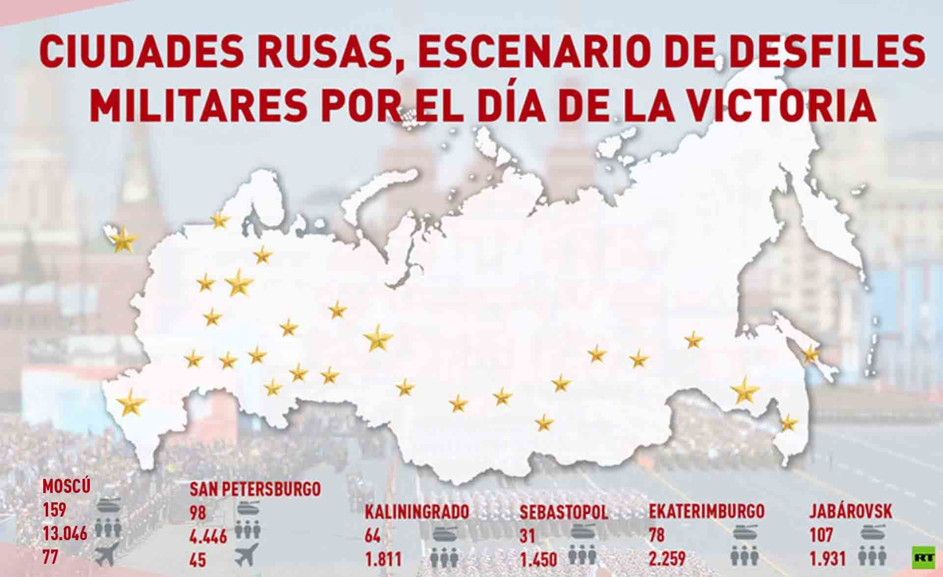 En este mapa aparecen todas las ciudades rusas que acogerán desfiles militares el 9 de mayo, con algunos ejemplos destacados: