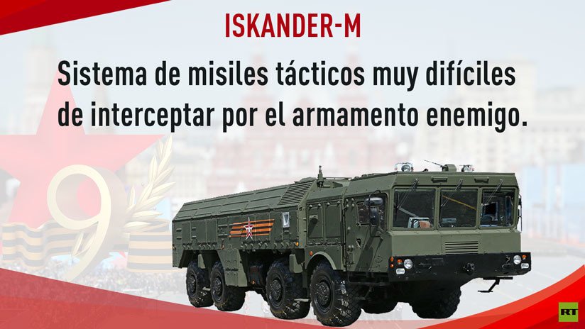 Tradicionalmente, la parte armamentística del desfile la abre uno de los símbolos de la Segunda Guerra Mundial, el legendario tanque soviético T-34, cuyas unidades entraron en el Berlín de 1945. Además, la columna de equipamiento militar incluirá vehículos blindados polivalentes Tigr y vehículos blindados BTR-82A, sistemas de misiles Iskander-M y Yars, complejos de misiles y armas antiaéreas Pántsir-S, así como sistemas de misiles tierra-aire S-400, vehículos blindados Taifún y un grupo de servicio de más de 100 unidades.