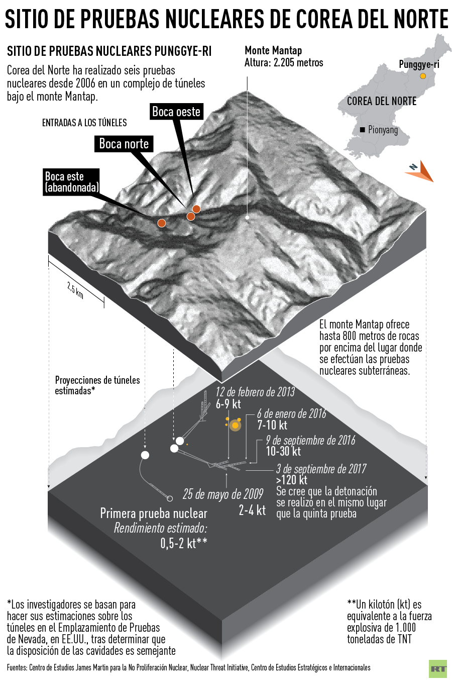 Ninguna persona resultó herida a causa de las seis pruebas que se llevaron a cabo en el lugar, ha añadido. Asimismo, el funcionario precisó que después del cierre de Punggye-ri no queda ningún polígono de pruebas nucleares subterráneas en Corea del Norte.