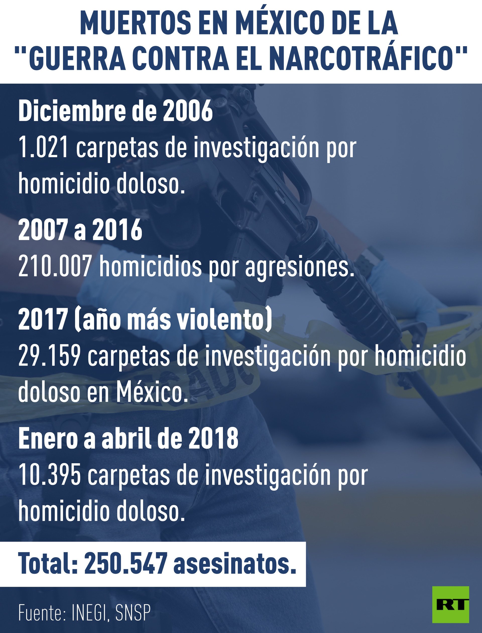 De acuerdo con fuentes oficiales, existe evidencia documental de al menos 250.547 homicidios en el país entre diciembre de 2006 y abril de 2018. Una cifra que evidencia las fallas del actual modelo de seguridad implementado desde hace poco más de una década en el país, el mismo que ha provocado una crisis humanitaria sin precedentes en México, con niveles de violencia equiparable a países en guerra.