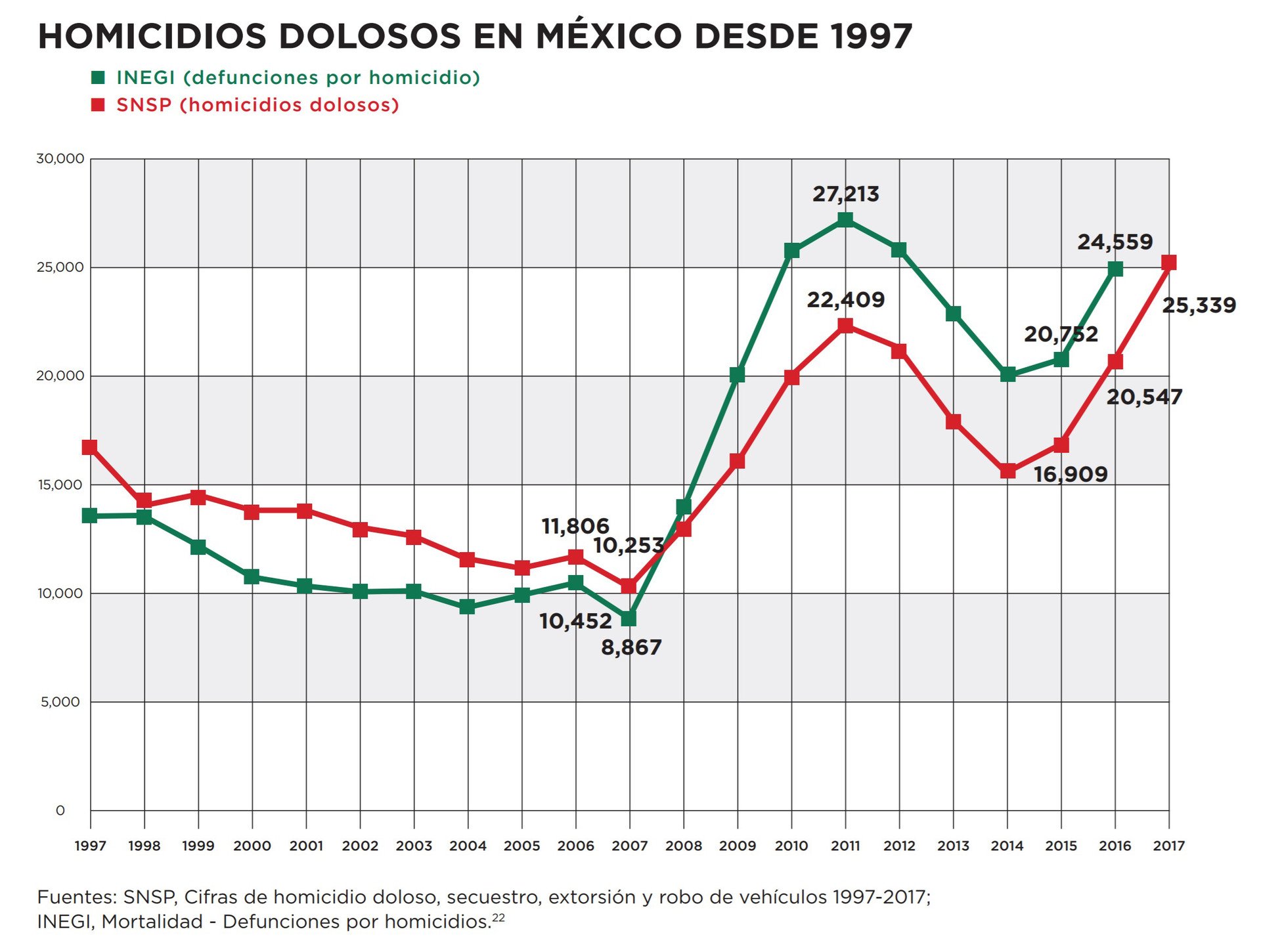 Datos del Instituto Nacional de Geografía y Estadística (INEGI) sostienen que de 2007 a 2016 se registraron 210.007 homicidios por agresiones.