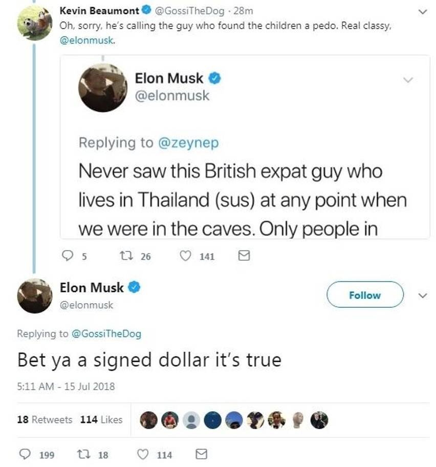 Después de que un usuario de Twitter subrayara que Musk estaba "llamando pedófilo al tipo que encontró a los niños", el multimillonario respondió: "Te apuesto un dólar firmado a que es verdad".