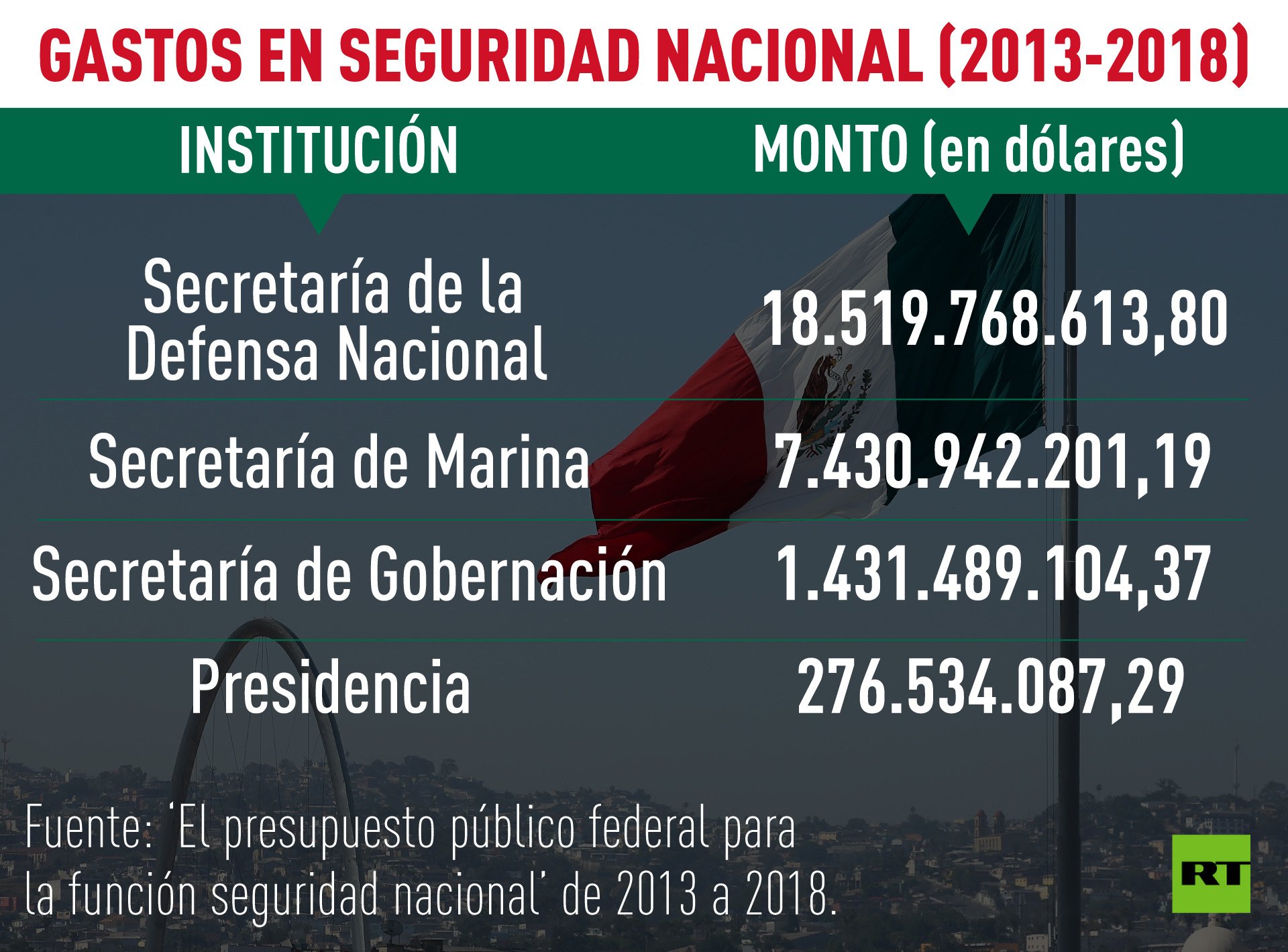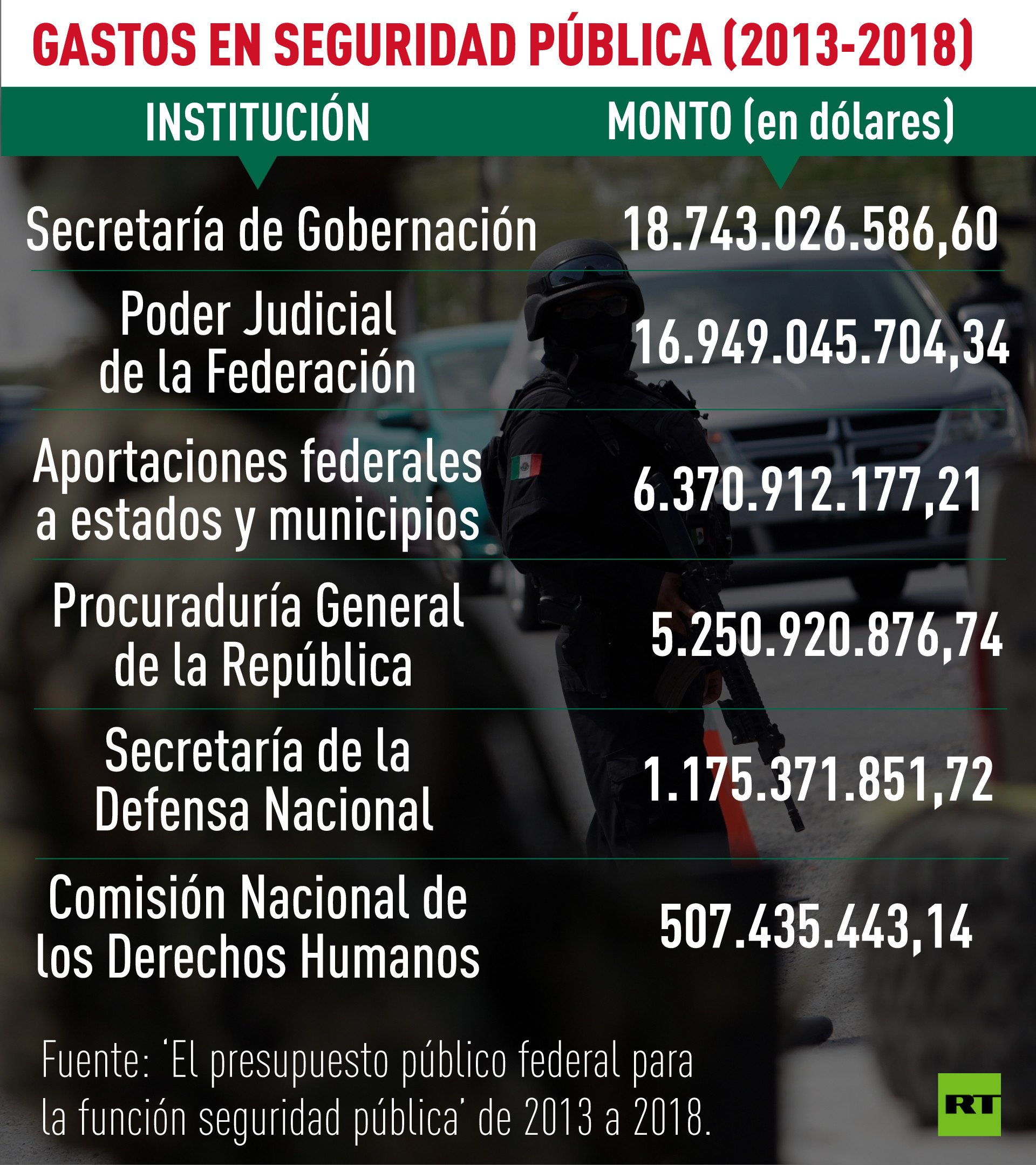 En el periodo de seis años, el mayor egreso lo concentra la seguridad pública: 49.556.730.993,66 dólares (934.223.670.000 pesos); mientras que en seguridad nacional ascenderá a 27.658.732.945,74 dólares (521.411.370.000 pesos), indican los análisis 'El presupuesto público federal para la función seguridad nacional' y 'El presupuesto público federal para la función seguridad pública' (de 2013 a 2018).