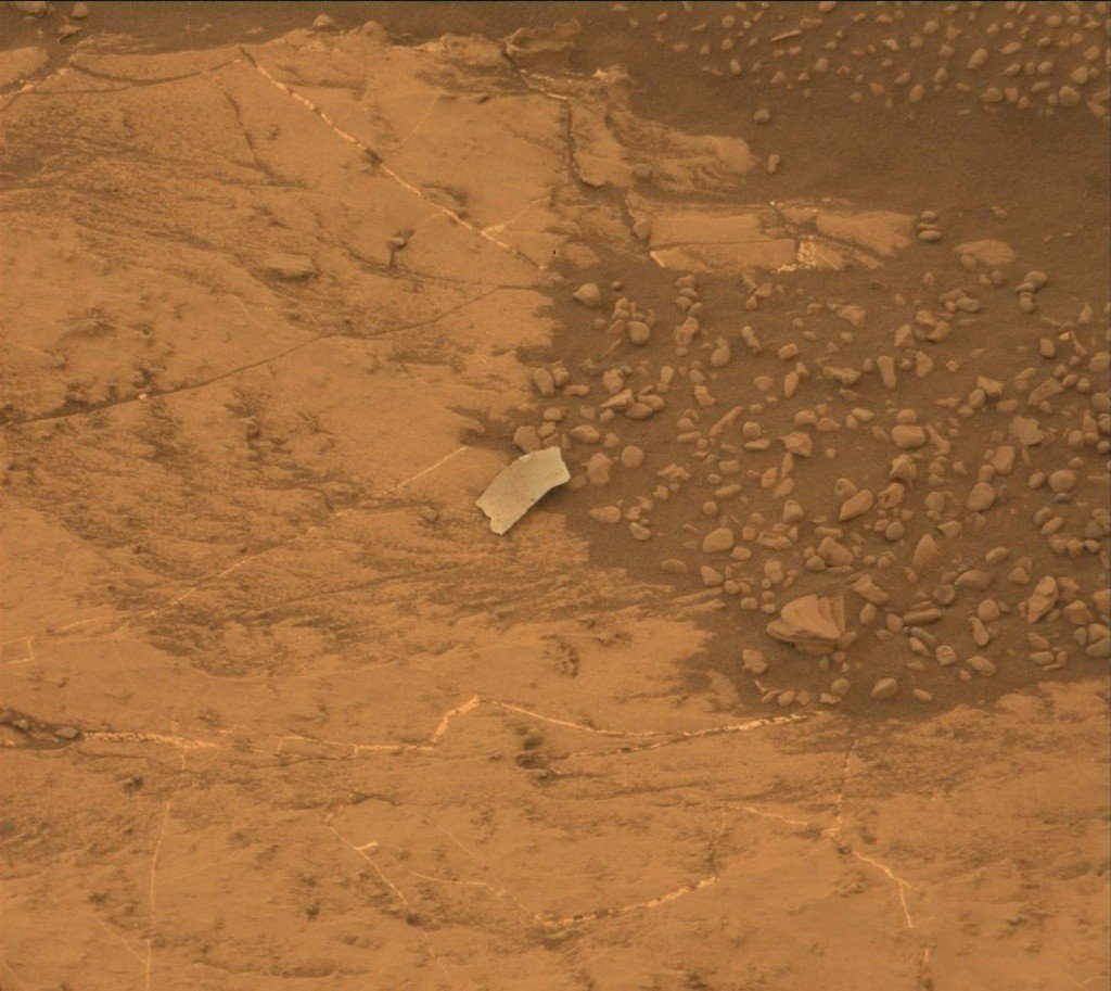 Este lunes el 'rover' Curiosity de la NASA fotografió un extraño objeto en la región de Pettegrove Point, situada en la cresta Vera Rubin de Marte. Los miembros del equipo de la misión inicialmente creyeron que el objeto, de forma plana y color blanquecino, podría ser un fragmento que se hubiera desprendido del vehículo robótico. No obstante, las observaciones del explorador marciano han determinado rápidamente que el objeto fotografiado no es nada extraño.