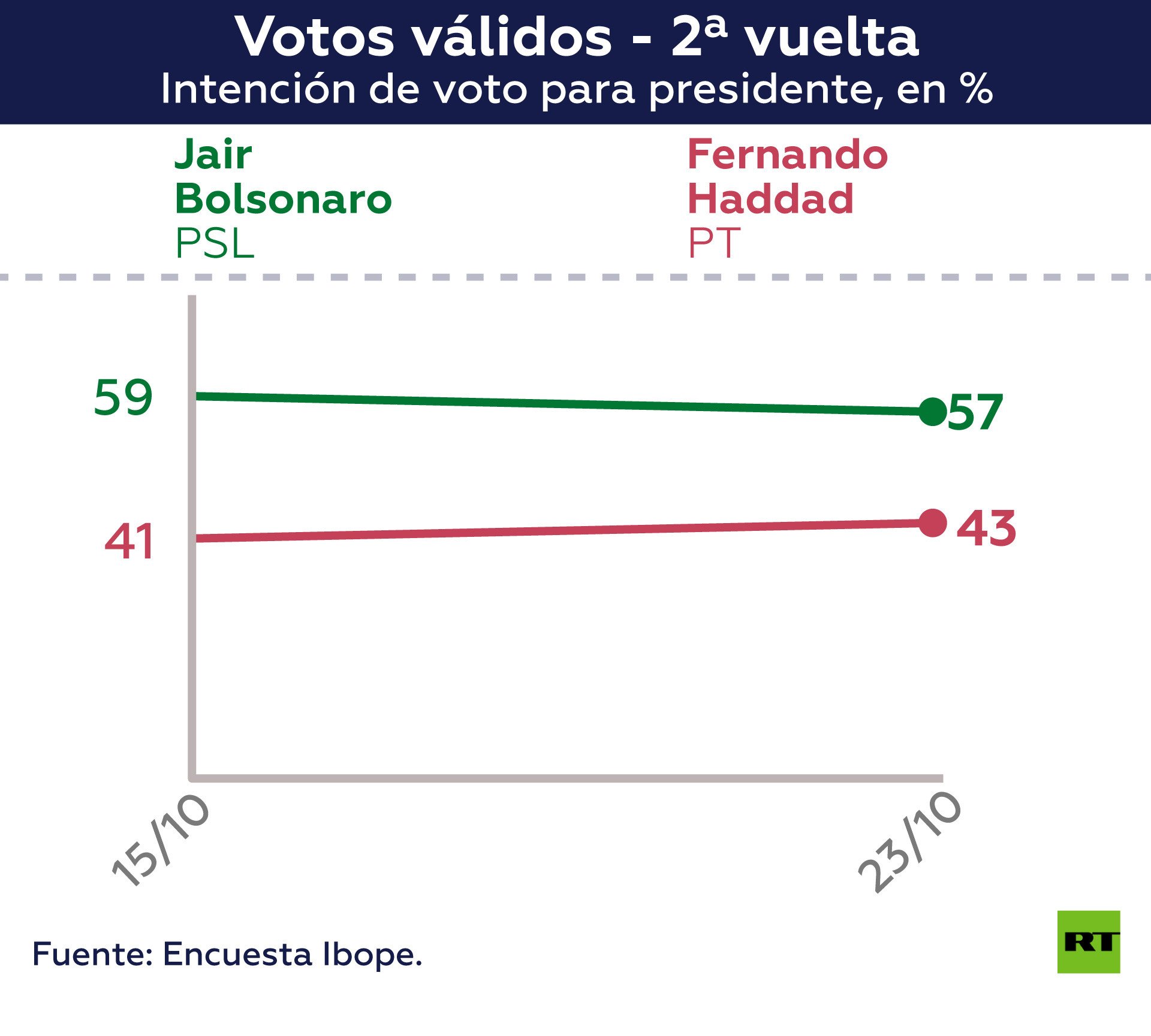 En un ambiente electoral altamente polarizado, Bolsonaro llega a la segunda vuelta como claro favorito, tras haber obtenido 48% de las boletas en la primera ronda y con una intención de voto que, según el más reciente sondeo de Datafolha, se ubica en 57%.
