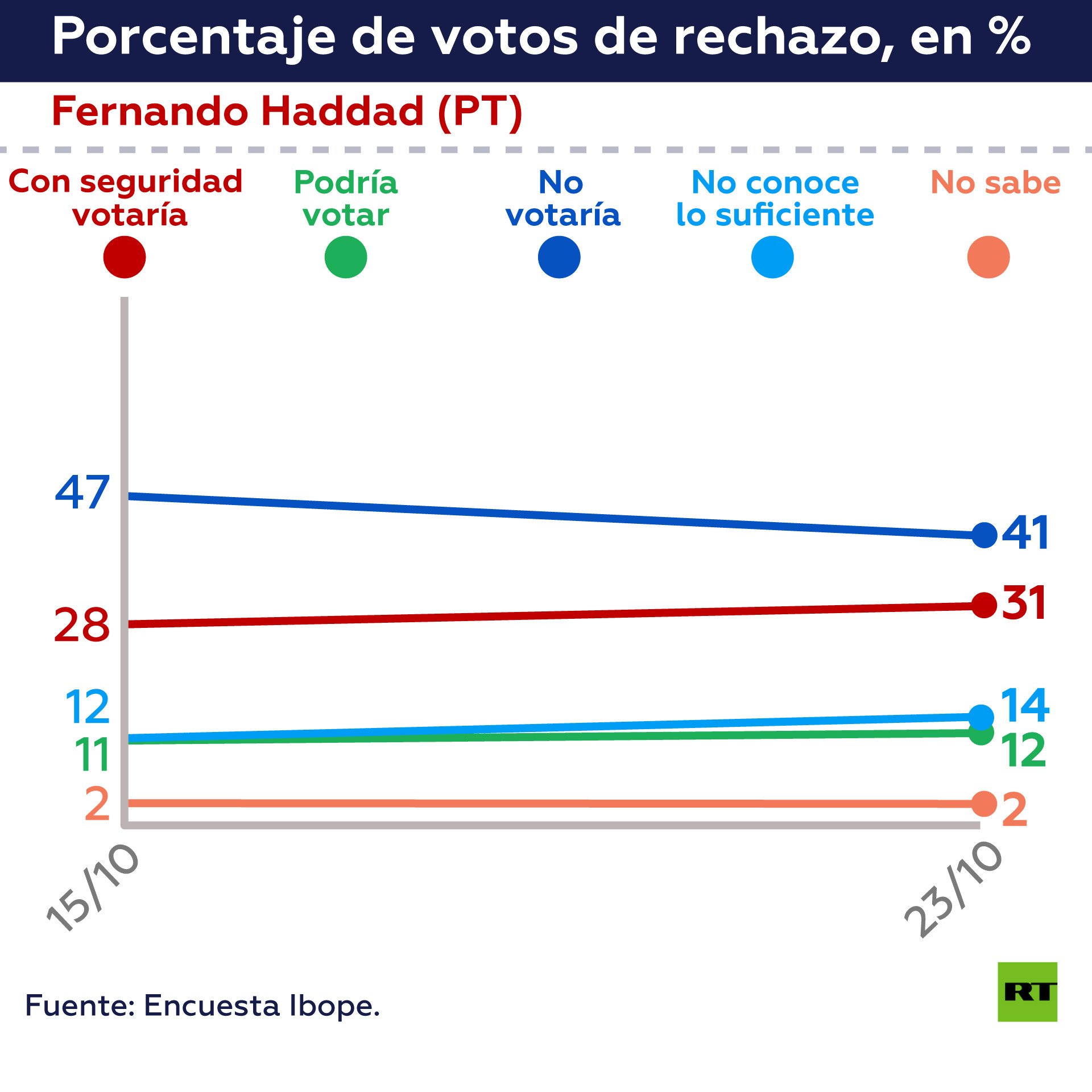 A pesar del leve repunte de Haddad con respecto a Bolsonaro, la brecha aún es amplia. La campaña del PT ha estado enfocada en la búsqueda desesperada de apoyos, mientras que el aspirante del PSL ya ha anunciado a algunos de los miembros de su futuro gabinete, en caso de resultar electo.