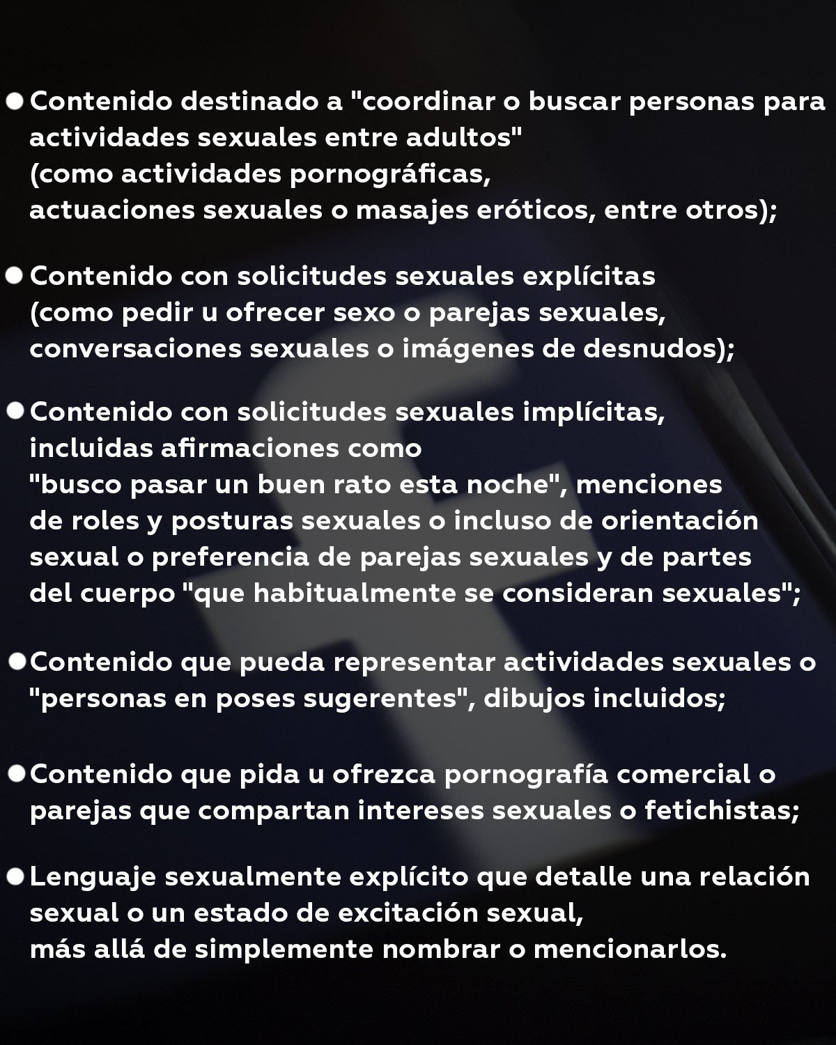 Hablar de posturas sexuales preferidas, compartir imágenes de "personas en poses sugerentes" o decir que busca "pasar un buen rato esta noche". Estos son algunos de los ejemplos de contenido sexual que a partir de ahora no podrá publicar en Facebook, tras la reciente actualización de sus normas comunitarias contra la solicitud de actos sexuales.